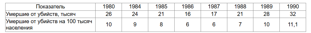 Можно сравнить данные по количеству убийств на 100 тыс. человек населения в СССР в 1989 году (12,4) и во Франции (1,1), Германии (1,0) и в Англии (1,04). Даже отдельно в Северной Ирландии, где в те годы шли кровавые столкновения, индекс количества убийств был почти в 3 раза ниже (4,72), чем в среднем по мирному СССР.