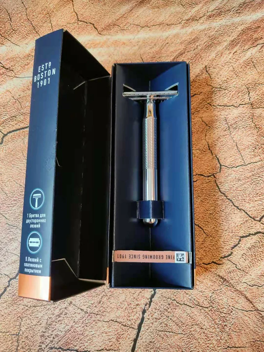 Поставляется в довольно стильной картонной коробке вместе с пачкой лезвий: