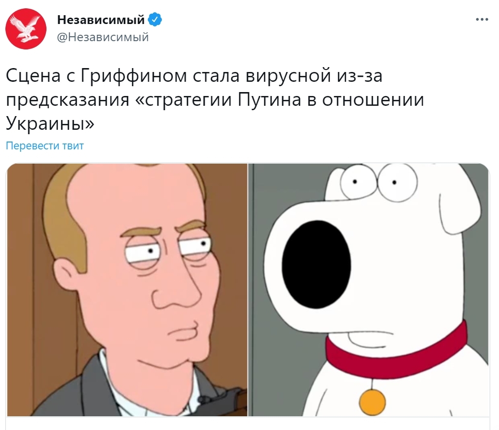 13 FancySunny Специфический юмор Ответ на пост «Все боятся»1 3 года назад Эта ситуация, кажется, довольно хорошо описана в вирусном клипе Гриффинов из эпизода восьмого сезона «Шпионы, напоминающие о нас». via Владимир Путин Гриффины Юмор Машинный перевод Скриншот X (Twitter) Россия Общество Мультсериалы The Independent Ответ на пост Вирусное видео Социальные сети СМИ и пресса Видео 2 2 Ещё 0