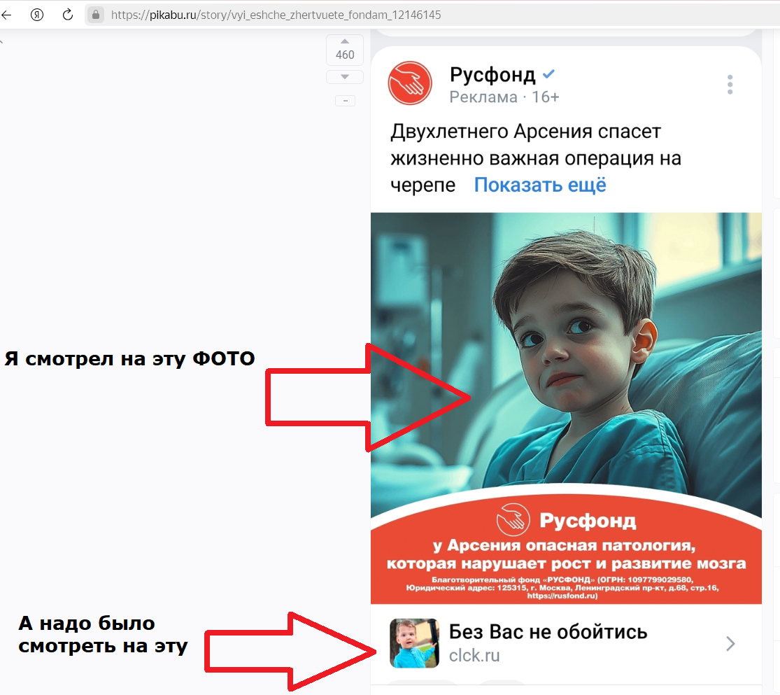 Скорее всего, автор поста не кликал по этому объявлению, поэтому он мог и сам ошибиться и других людей мог ввести в заблуждение (его пост уже набрал более 25 000 просмотров и есть вероятность, что кто-то из Добрых людей после прочтения этого поста перестанет помогать больным детям, так как уже и в комментариях пошли гневные сообщения в адрес РусФонда)...