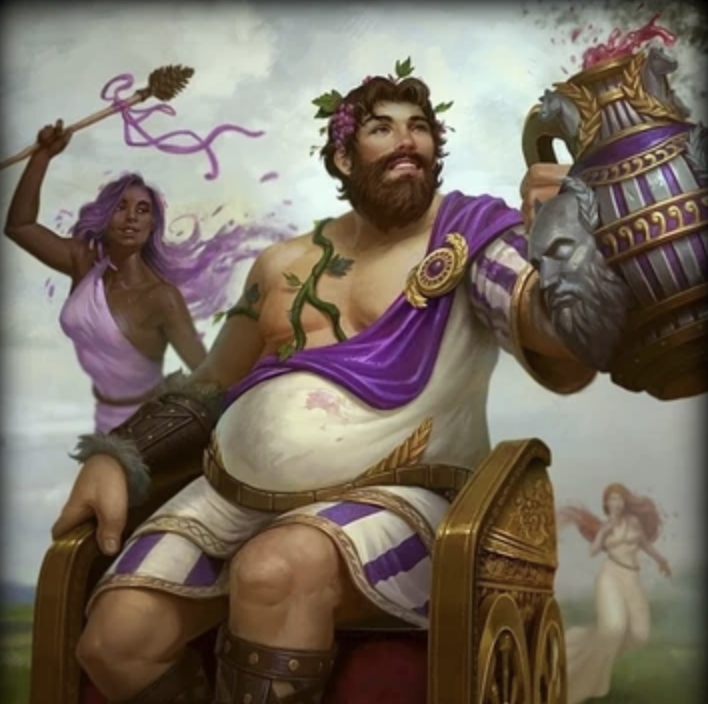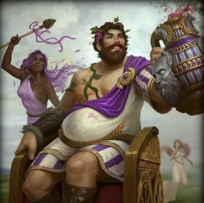 На минуточку, Дионис - древнегреческий бог вина, виноградарства, экстаза, растительности и театра, также известный под римским именем Вакх (Бахус). Рожденный от Зевса (т.е. папа его очень большая шишка на Олимпе) и смертной Семелы.