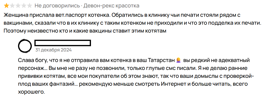 В клинике нам сказали, что такого котенка у них не было, паспорт поддельный, а печати ставил, по всей видимости, уже уволенный сотрудник, который, вероятно, “подрабатывает” с этой заводчицей.