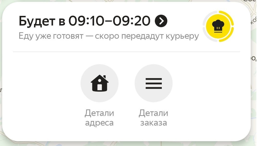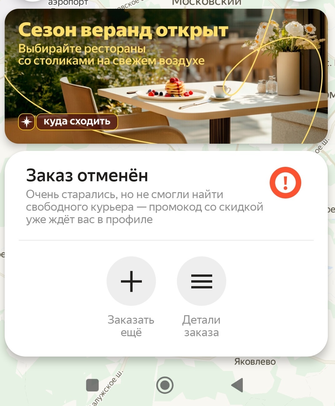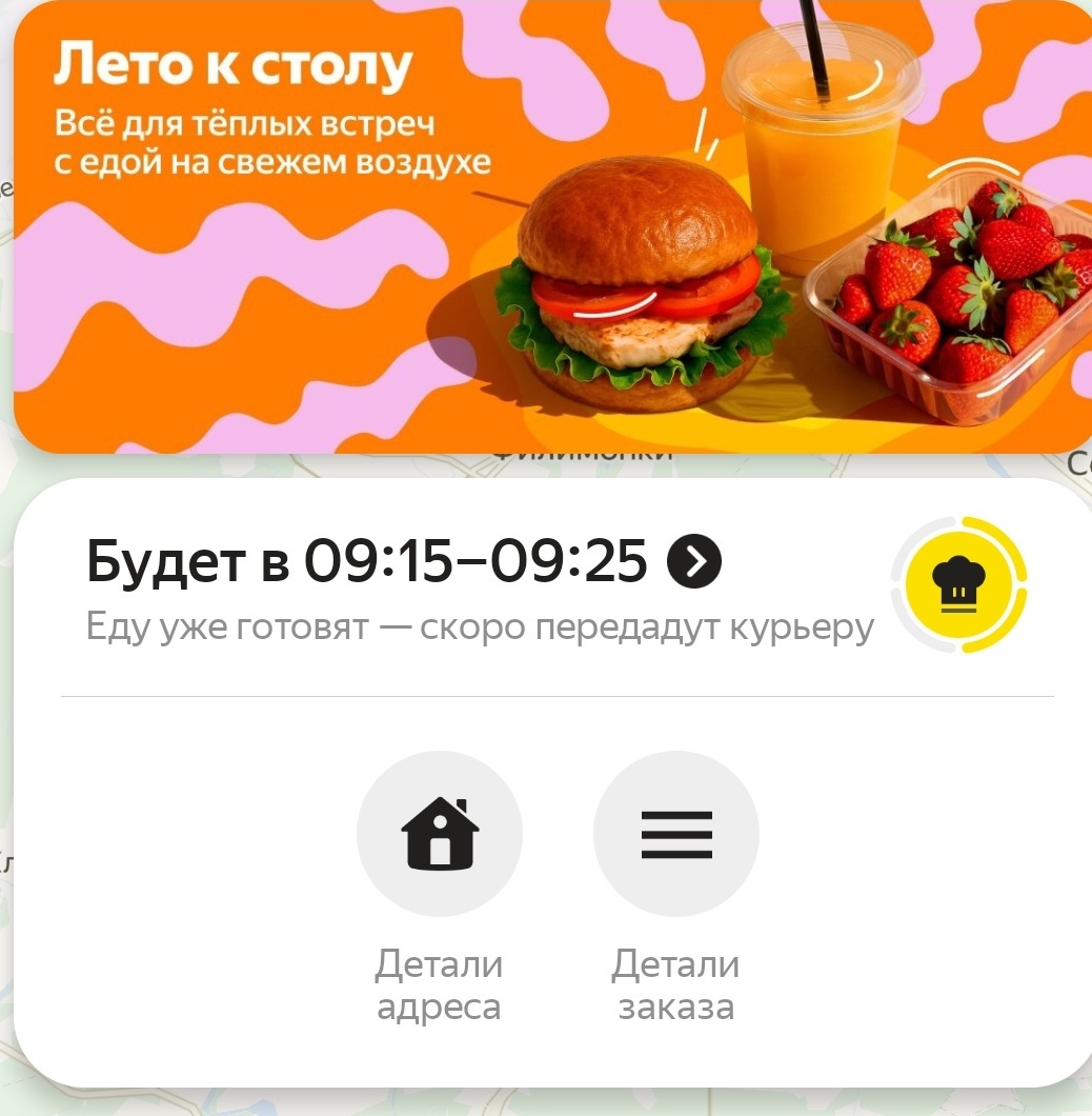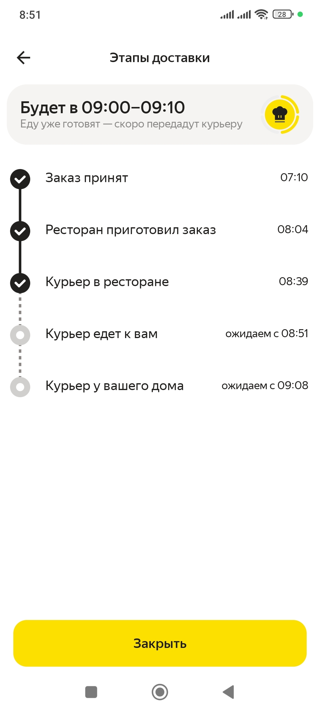 Тоже решил заказать покушать перед работой) В 7:10 заказал, должны были приготовить и привезти за 60 минут +-. Ресторан приготовил в 8:04, хотя к этому времени должны были уже привезти. Дальше ожидаемое время текло, текло, увеличивалось. И курьер почему то приехал туда аж спустя 40 минут. Далее он че то там делал (танцевал с бубном), я написал в поддержку. Поддержка позвонила ему, он трубку не брал, и тогда поддержка переназначила курьера ради "ускорения" доставки. Зная как работает желто-черный вредитель, я заранее предвкушал как мне отменят заказ) И написал об этом в поддержку) И что? Правильно, заказ отменили)