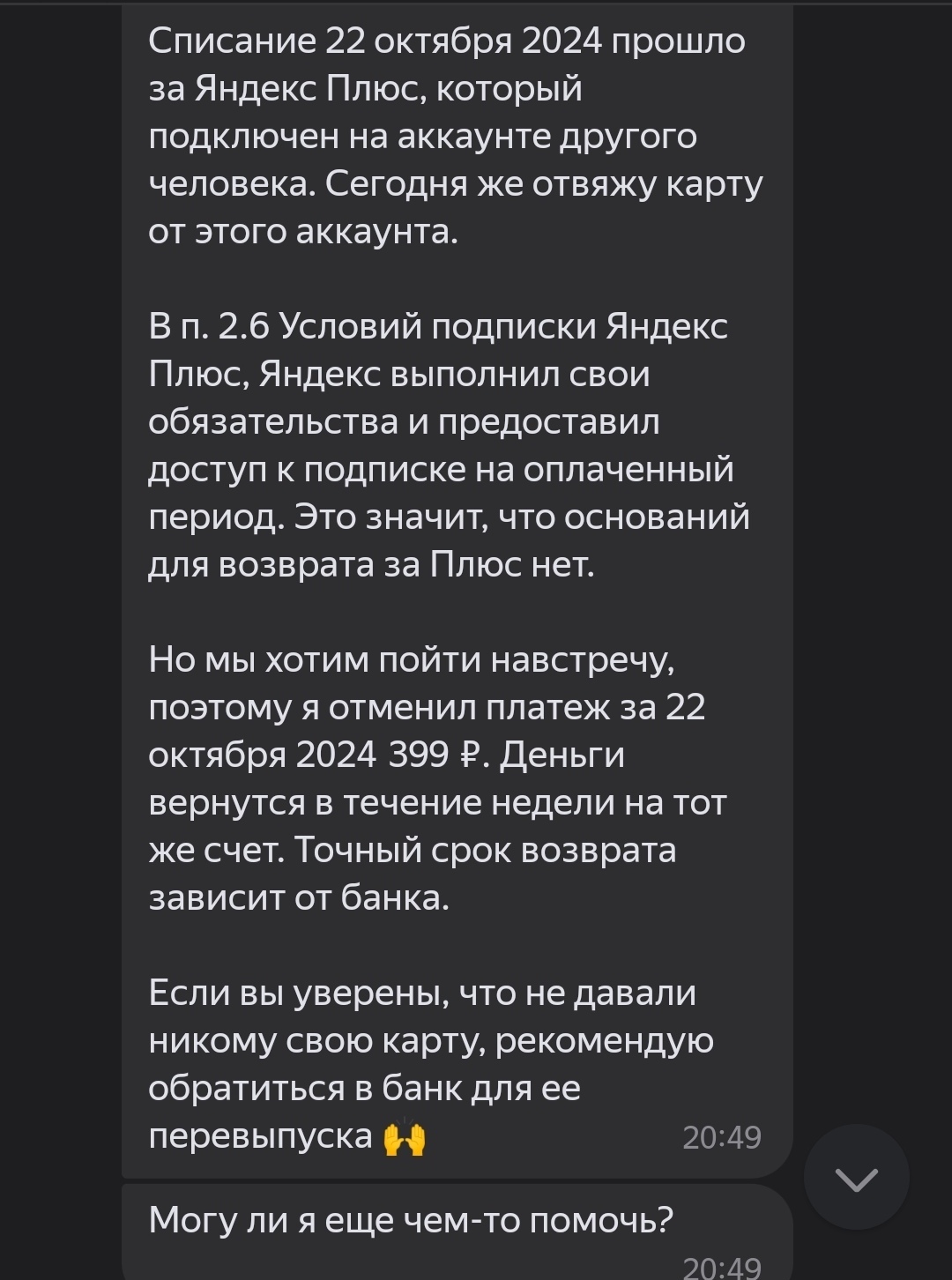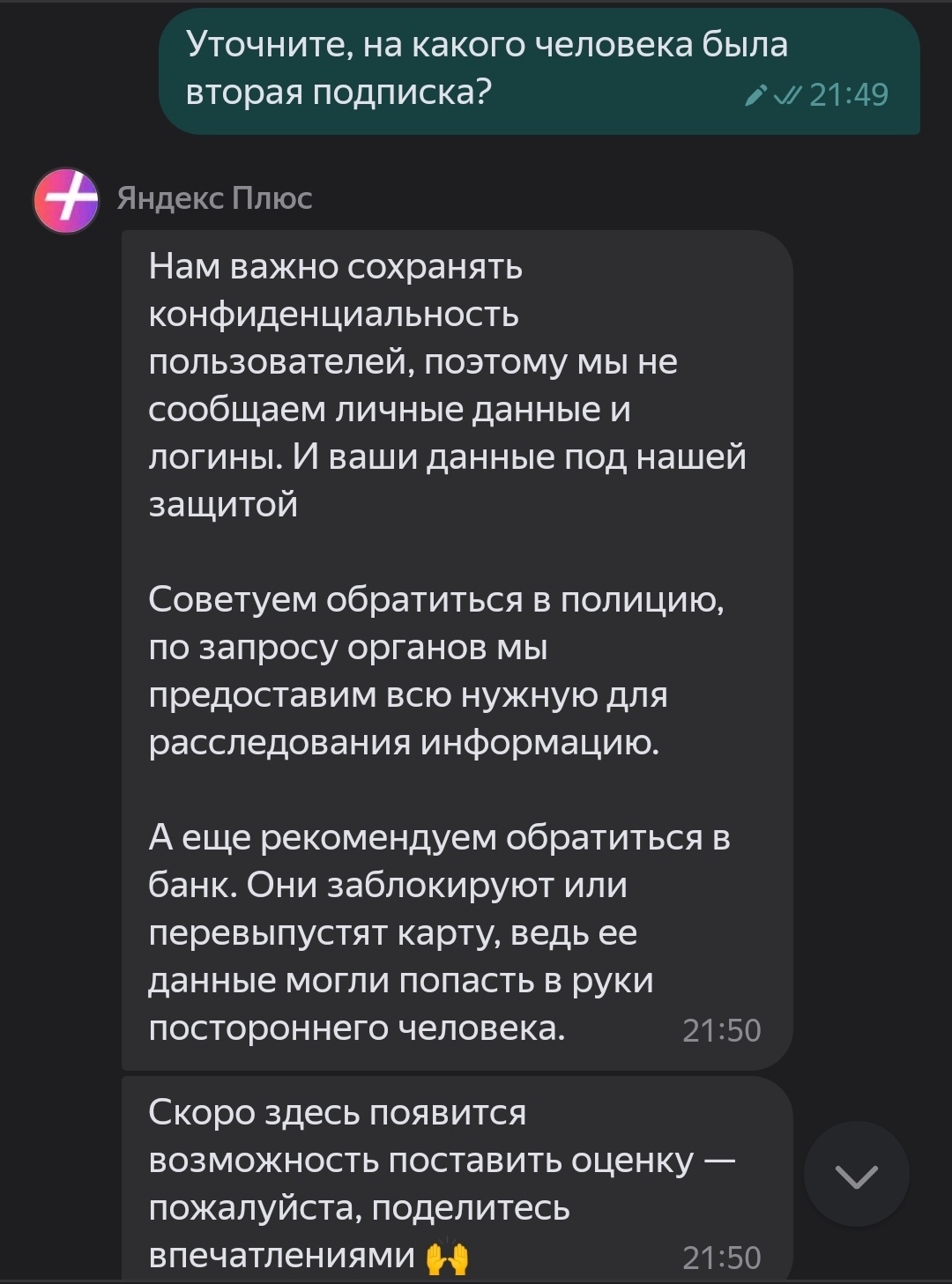 В поддержке был робот, который долго водил по кругу. Когда, наконец, удалось связаться с человеком, ответили, что по моей карте оформлена подписка на еще один аккаунт. Карту, конечно, я никому не давал. Да и без подтверждения подписку не оформить.