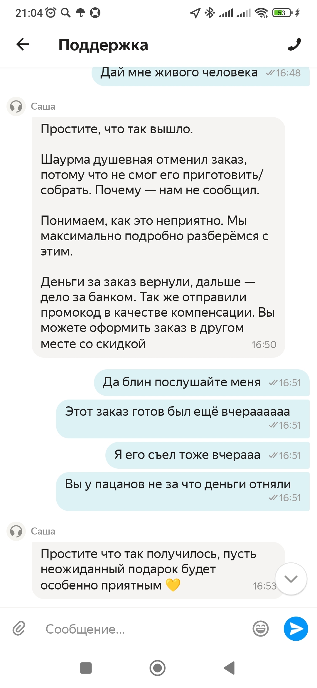 Ахахаха, на днях было, беру постоянно гирос в одном месте, купил как обычно вечером, съел, на следующий день открываю приложение яндекс.еда а там до сих пор мой заказ висит в статусе "готовится". Ну я думал ща напишу в поддержку, скажу что все норм, измените статус я опять хочу заказать.... Я блять 3 раза объяснял этим затупкам, что заказ я уже забрал, съел, я всем доволен и вообще уже проклял что написал вам. А итоге они просто ОТМЕНИЛИ заказ и вернули мне деньги за заказ, который я уже давно съел))) Ну я конечно потом пацанам всё объяснил, и денег им отдал назад, но вот так просто Яндекс взял и кинул шаурмячку на бабки...