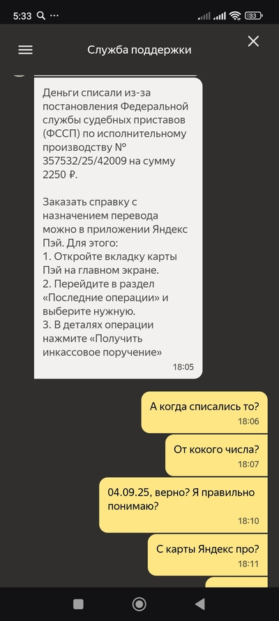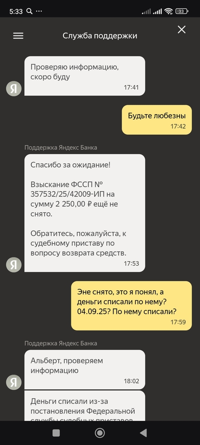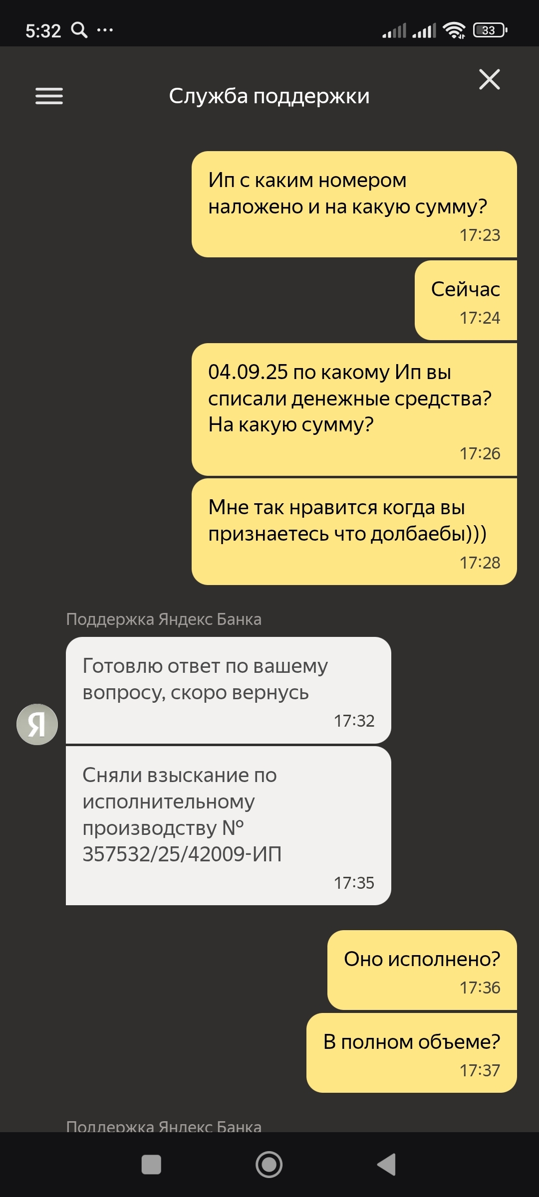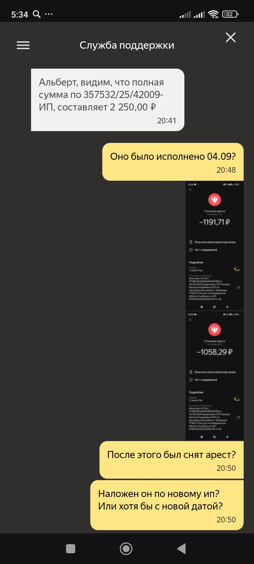 Сегодня возвращаясь с работы в такси, увидел что всё что все что заработал за день пропало с карты. Карта Яндекс банка. Каково было мое удивление что после общения с поддержкой выяснилось что эти ребята повторно списали денежные средства по уже исполненному ими исполнительному производству!! Штраф ГИБДД. Штраф который они же ранее, 04.09.25 перечислили, с этой же карты и этого же счета!!