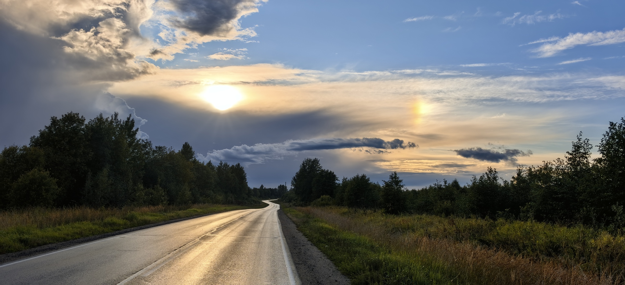 Летом гало не видел ни разу, вчера аж остановился, фото не особо передаёт реальность, слева чернота, и два очень ярких солнца, через минуту ливануло стеной, чукча не фотограф