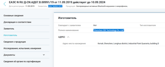 Жмем на "реестрах Росакредитации" и видим сертификат соответствия, в котором указан заявитель ООО "КЕЙСГУРУ" и изготовитель "Shenzhen ISK Technology Co., Ltd".