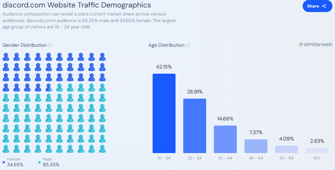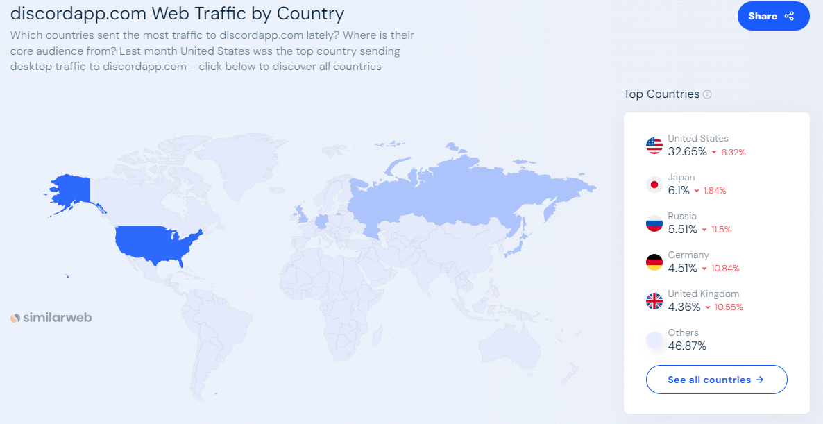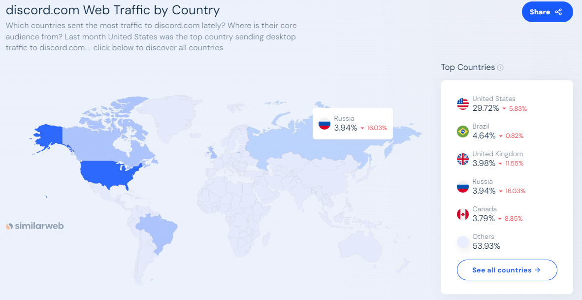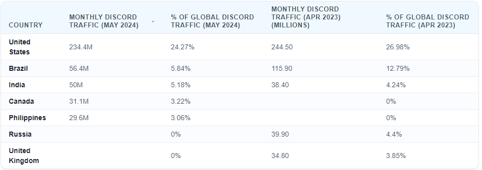 Пользователи Discord по странам Учитывая, что Discord изначально задумывался как игровая коммуникационная платформа, неудивительно, что в 2023 году больше всего ежемесячных пользователей Discord будет в США - 244,5 млн пользователей, что соответствует 27 % мирового трафика Discord. На втором месте Бразилия - 115,9 млн пользователей или 12,8 % ежемесячного мирового трафика Discord. Далее следует Россия с 39,9 миллионами пользователей (4,4 % месячного трафика), а за ней - Индия с 38,4 миллионами пользователей (4,24 %). Великобритания также попала в список с 34,8 миллионами пользователей, или 3,85 % месячного трафика Discord.