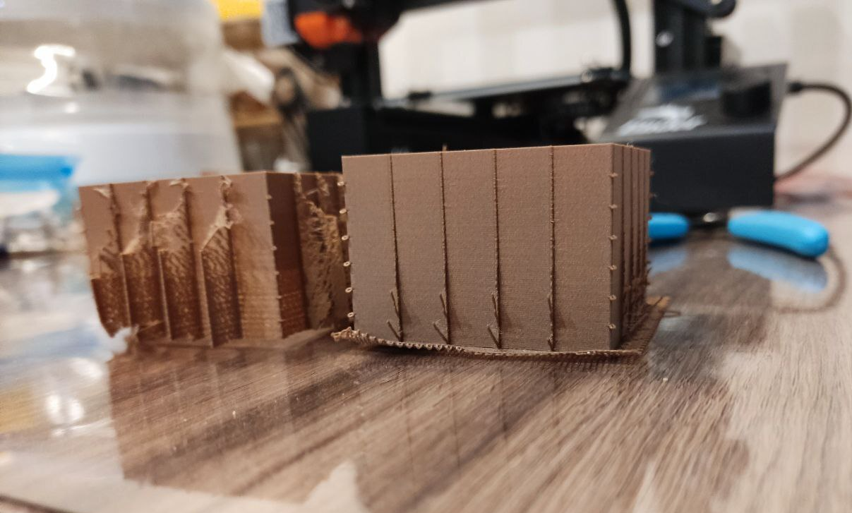 PETG. Один и тот же gcode. Модель внизу - немного "сырой" пластик, модель сверху - тот же пластик после 6-10 часов сушки