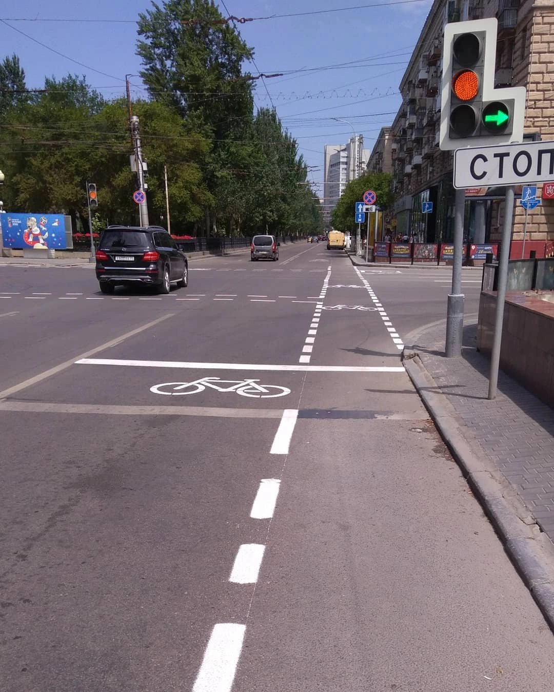 В Волгограде семь лет назад экспериментировали с разметкой - создавали так называемые "велобоксы" - накопительная зона перед основной стоп-линией, что бы велосипедисты могли останавливаться на запрещающий сигнал светофора перед машинами. ...ну и там были дополнительно еще всякие интересные решения. Размеры и расположение разметки брали из немецких стандартов.