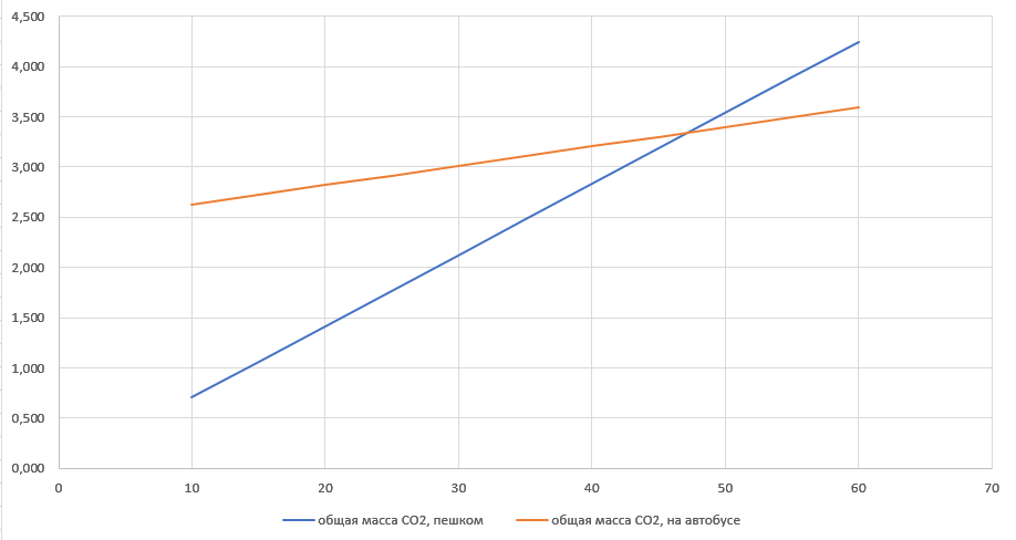 То есть без автобуса на ~600 грамм CO2 больше. Вот так вот. Но это работает только если народу много. Если на том же автобусе едут не битком, а только штатные 30 человек, по количеству сидячих мест, то получаем ~3 кг CO2, а пешком только 2.1 кг. При таких исходных данных автобус выигрывает, если пассажиров где-то 47-48 человек.
