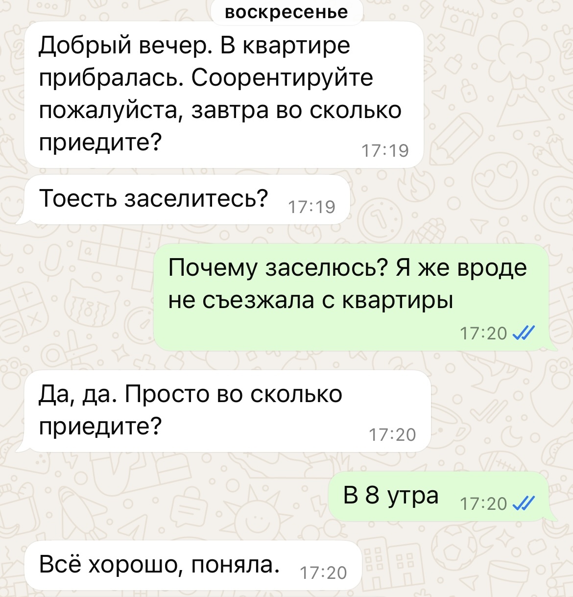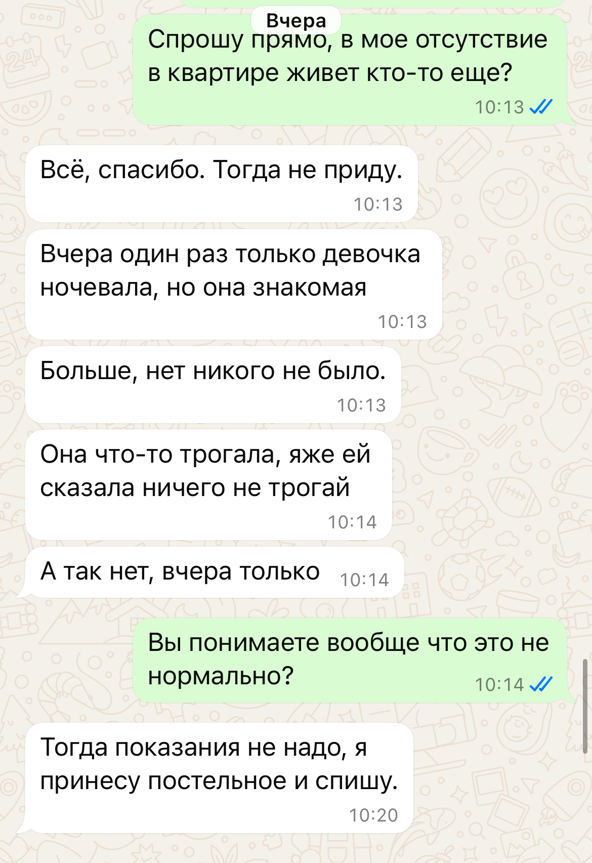 Возвращаюсь в понедельник утром и понимаю, что вещи лежат сильно не на своих местах (не как после приборки) и кто-то съел мою еду и оставил грязную посуду. Тут я уже понимаю, что происходит, но до последнего надеюсь, что это просто хозяйка прибиралась, устала и решила поесть (тоже так себе ситуация, но это можно пережить). Начинаю задавать вопросы и вот что выясняю: