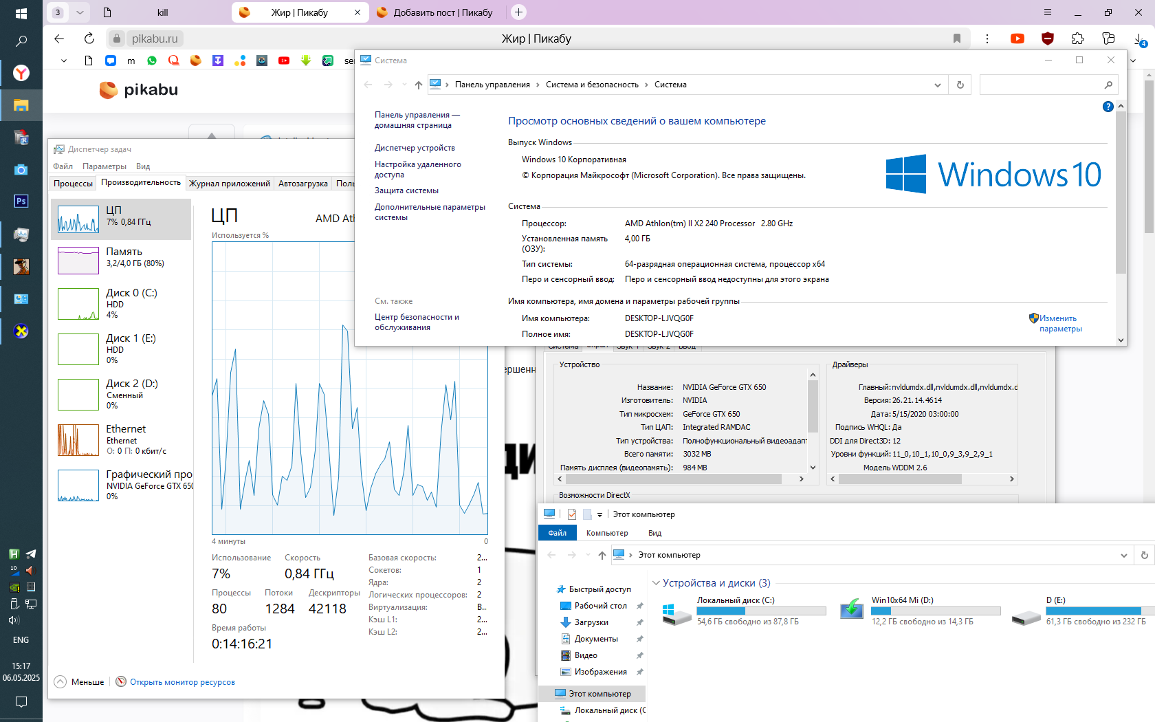 У меня старик вообще, всё же стараюсь поддерживать его в чистоте как системно, так и физически, ухаживаю, чищу везде, да и из апгрейда там только кулер наверно обновить можно )) Надо б/у связку брать только, видюха нормальная для моих требований, в новое не играю, играем вечерами с другом детства во что нибудь старенькое (кстати, на фоне свёрнут самп гта са), вечерами делать порой нечего и поигрываем в гта, warcraft3, command and conquer generals и т.п., донат был раз и рад очень, да хоть 10р если и задонатят там, где я не "клянчу" и тому рад буду и дай бог человеку здоровья! =) Но не надо, тот донат был я "по приколу" давно включил и неожиданно...вскоре найду надеюсь работу по силам.