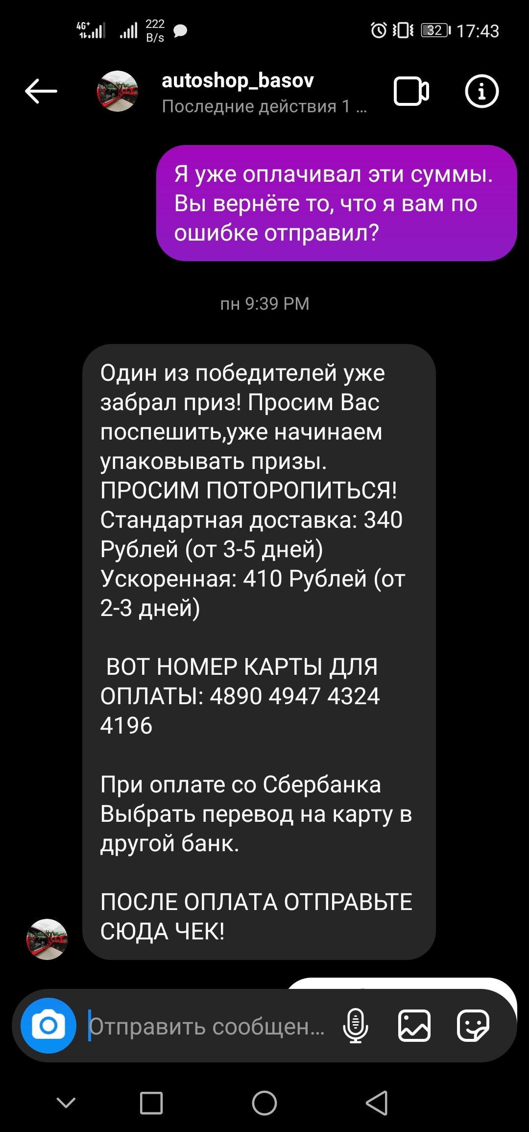 О как, мошенникам мало, они меняют условия, подогревая интерес, путаясь, то упаковано, то уже пакуют, то кто-то забрал уже. Замечаю, что ни одного "живого" сообщения, одни шаблоны. Уже понимаю точно что развод, хотя поначалу было стыдно что обманываю.