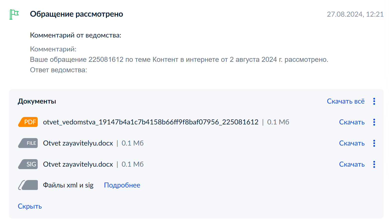 Вот также скриншот из госуслуг с теми же документами. В pdf содержится исходное содержание моего обращения и указание, что ответ содержится в приложенном документе Word.