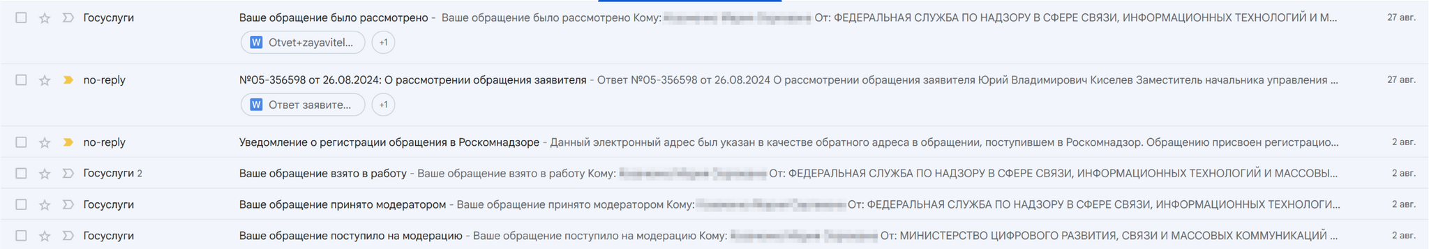 Мое обращение поступило в работу. Его приняли в Минцифры и перенаправили в Роскомнадзор, и уже из РКН мне пришел ответ по обращению.
