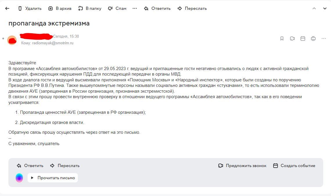 В связи с этим прошу провести внутреннюю проверку в отношении ведущего программы «Ассамблея автомобилистов», так как в его поведении усматривается: