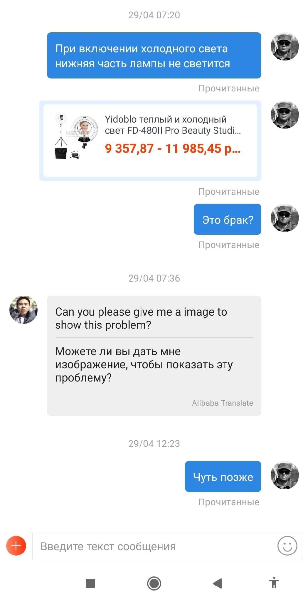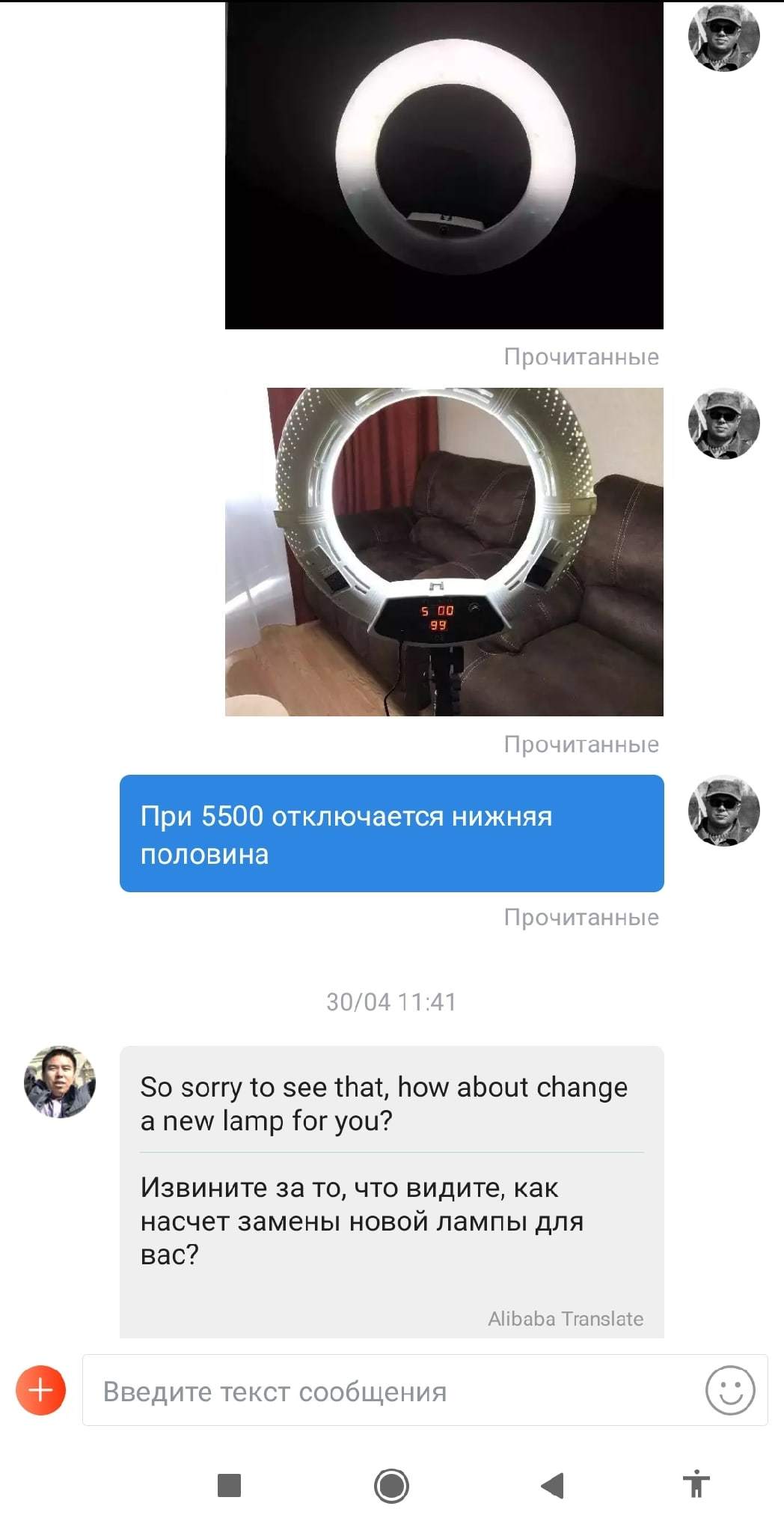Заказывал на али кольцевую лампу, стоимость на тот момент была 10225 рублей. Лампа приехала, но при проверке оказалось, что нижняя часть холодных светодиодов не горит.