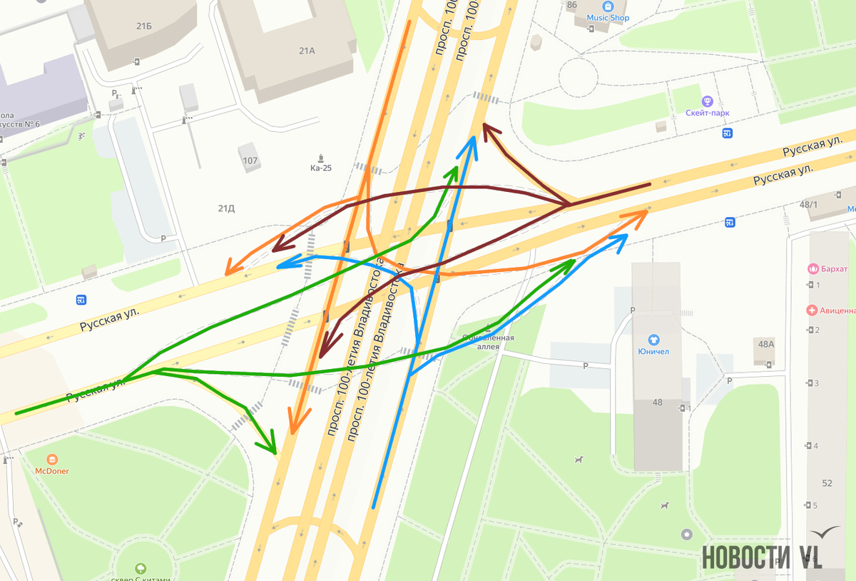 Есть во Владивостоке проблемный перекресток, Русская -100 летия. Даже в самый тихий день, там всегда ужасные пробки. Авторадио, когда говорит о пробках на дороге, говорит, что пробок почти нет, кроме Русской. Ну а в обычные часы, даже не час пик, там можно стоять по часу.
