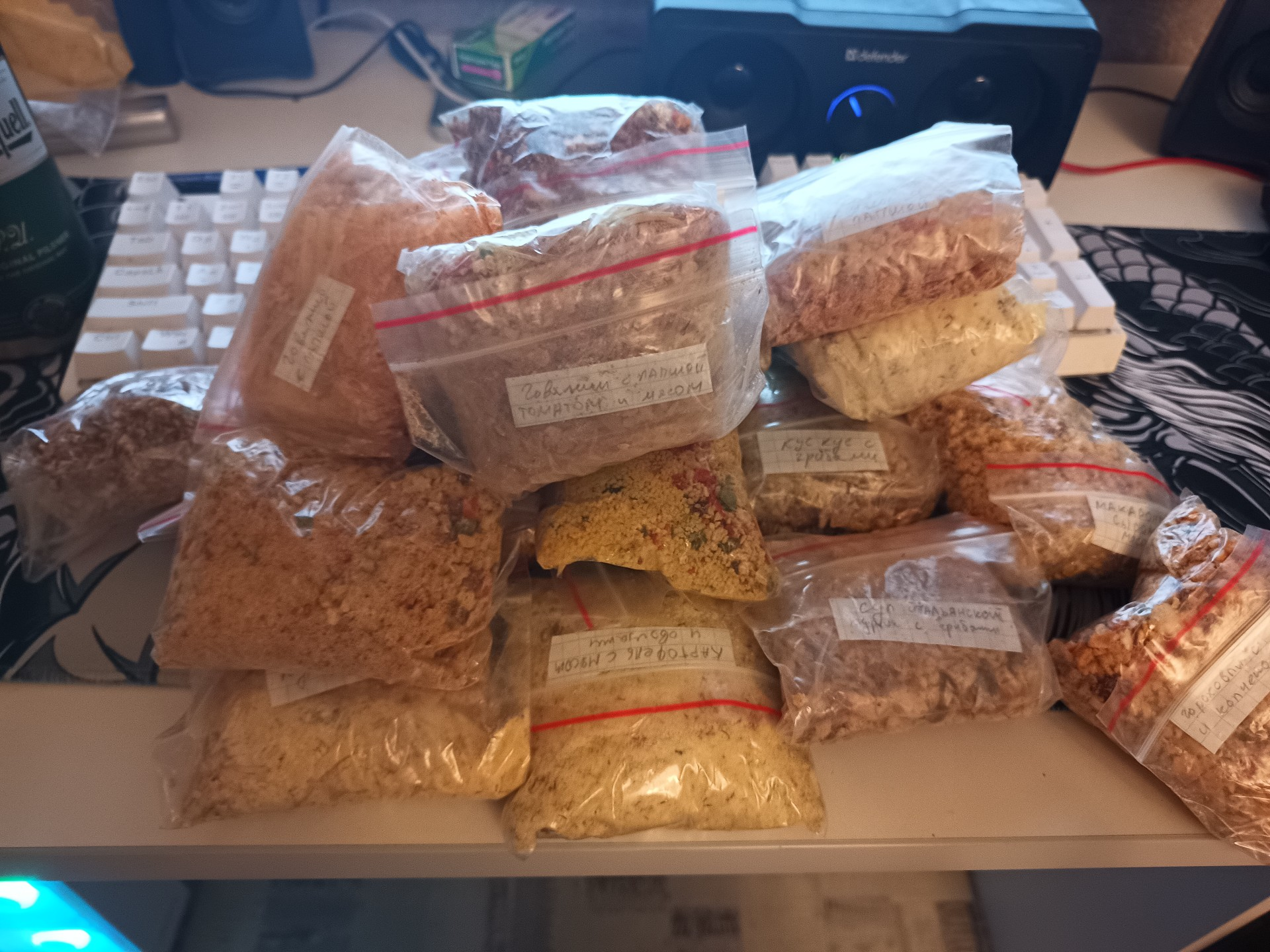 Отвечу почему соевый фарш: я ранее несколько раз ездил с сушеными овощами: морковь, капуста, лук, картофель кубиками, свекла, и ко всему этому сушил говяжий фарш. Т.е. "мясной вкус" давал именно фарш. А тут я нашел офигенные костные бульоны и решил не заморачиваться с сушкой мяса, а использовать "мясозаменитель". Как наполнитель желудка работает отлично, во вкусе не теряет, ибо впитывает бульон, а стоит сильно ниже.