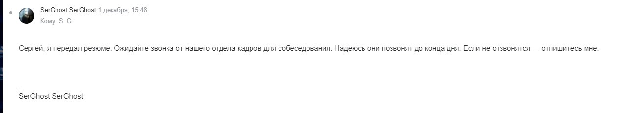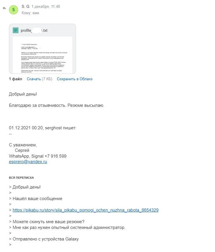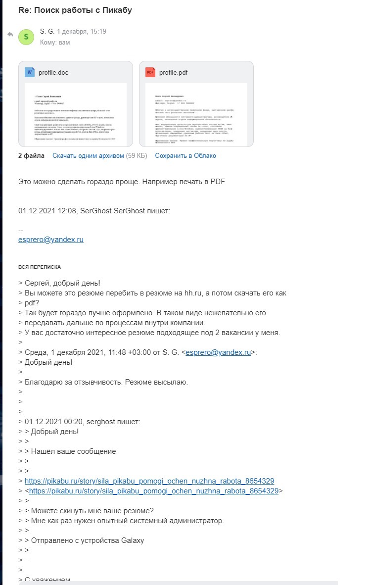 добрый день. У меня есть только 2 его письма и 4 моих, переписка с личной почты была, остальное было уже через отдел кадров.