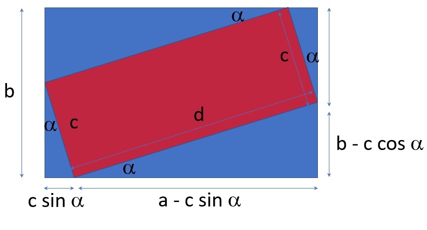 Пусть a — ширина основного прямоугольника, b — длина основного прямоугольника, c — ширина вписываемого прямоугольника и d — длина вписываемого прямоугольника (неизвестно), α — угол наклона (неизвестно).