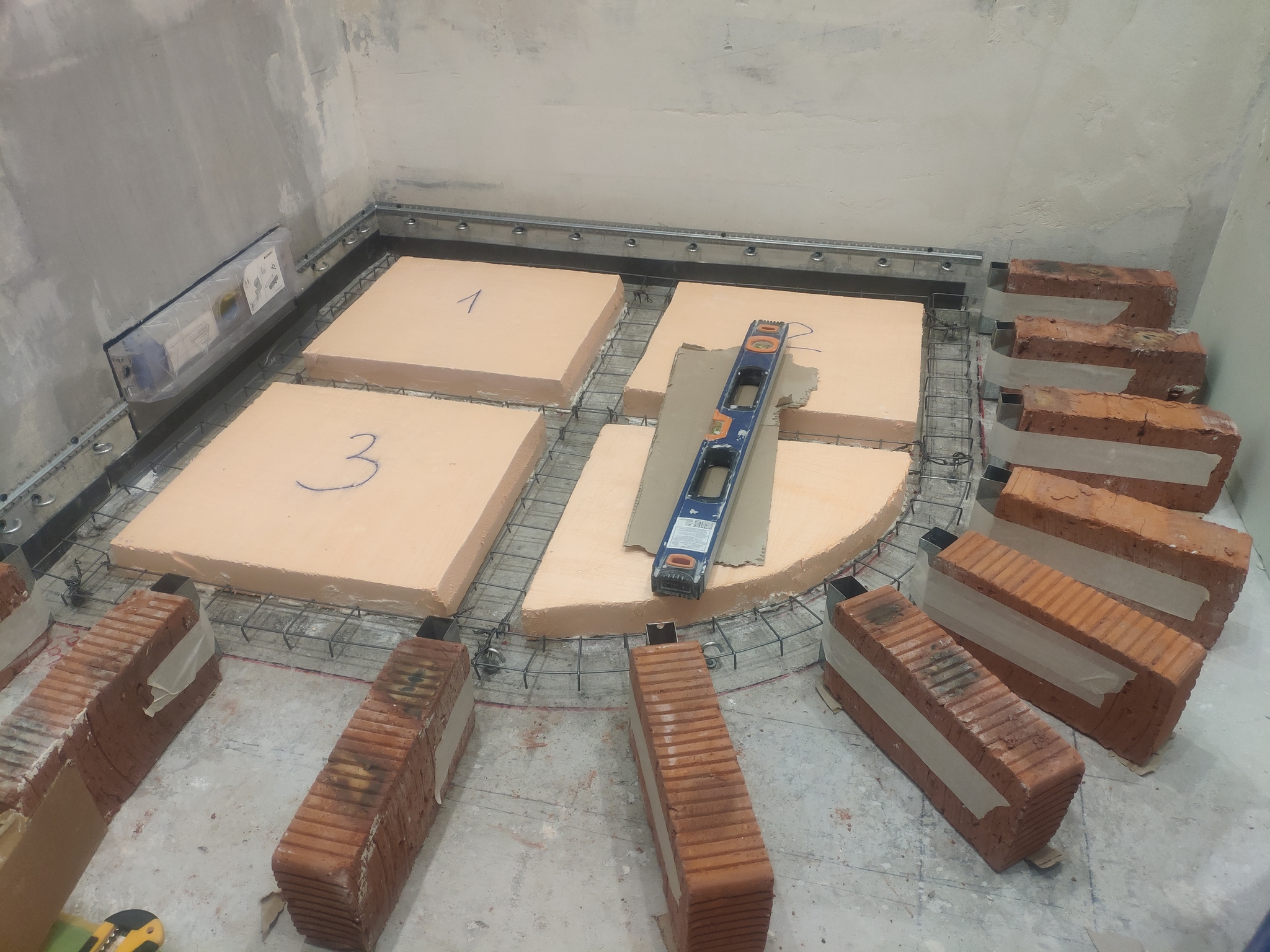 Армирование какое никакое, облегчение поддона xps на клей-пену (прижимал грузом), кольца в стенах чтобы не уползло - потом сетку к ним прикрутил, профиль - для контроля уровня, опалубкой выступили остатки пластиковых откосов. Для душевого ограждения 1*1м