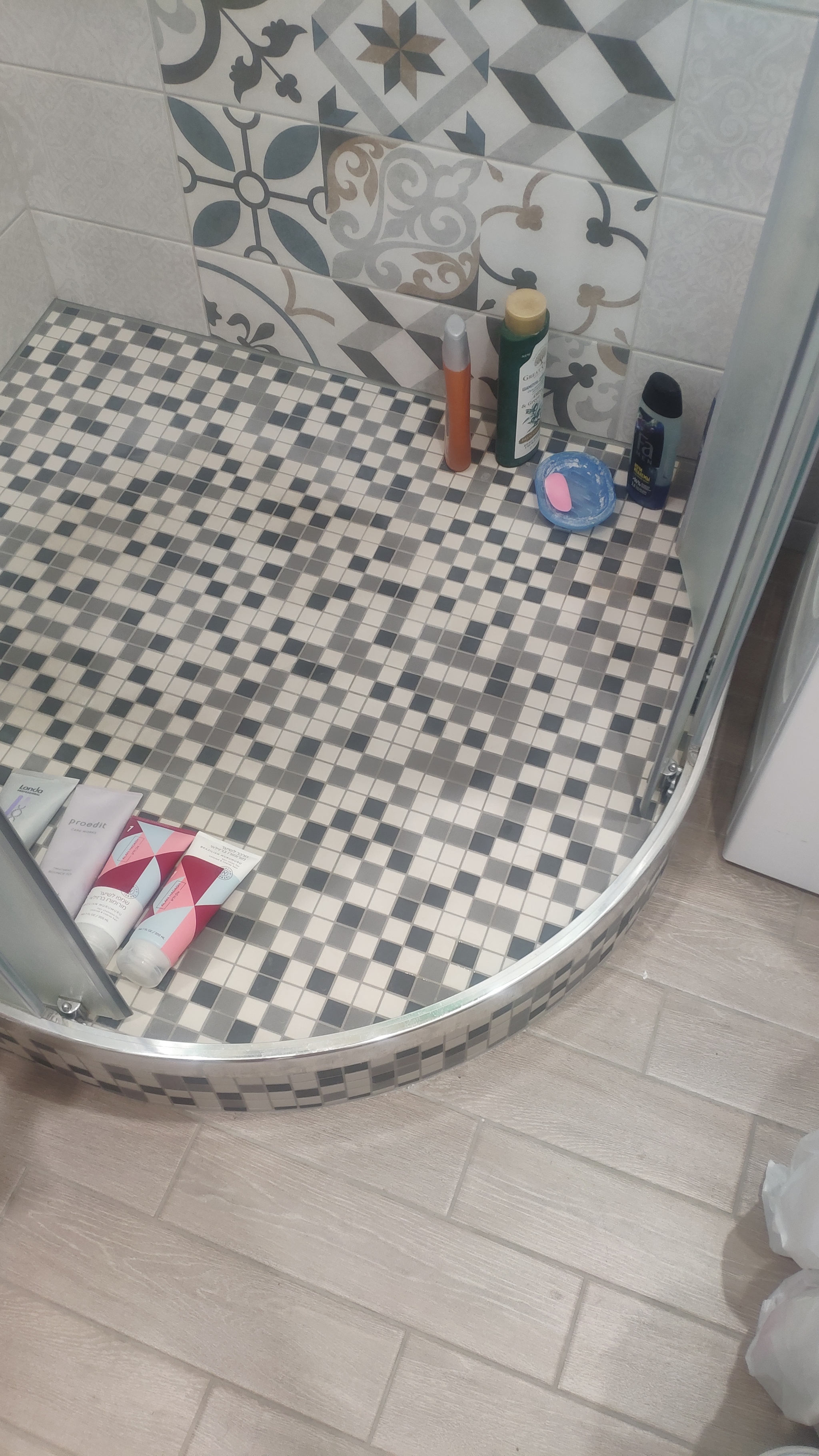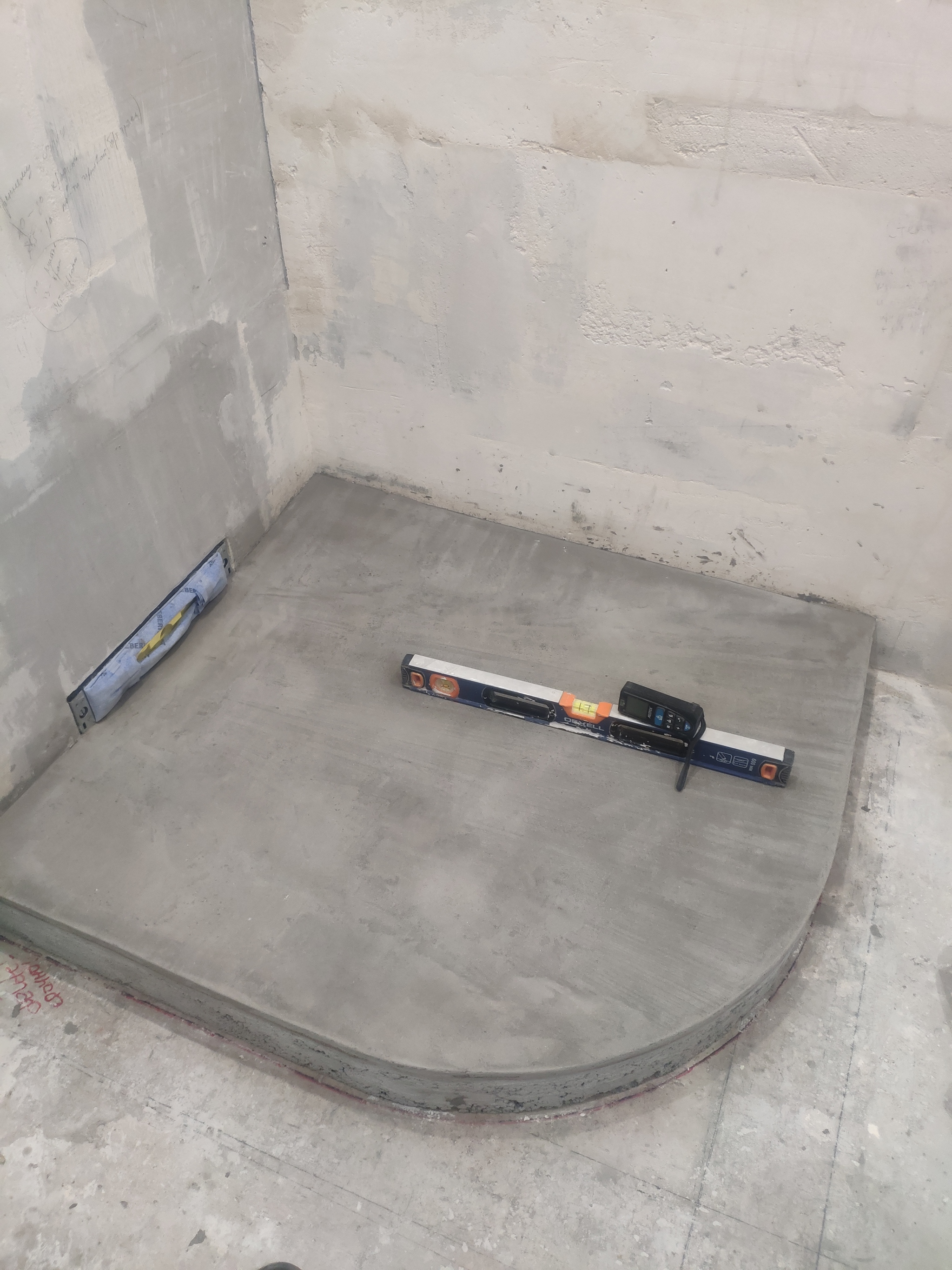 Приложил основание душевого ограждения, для контроля геометрии поддона - чтобы рама душевого ограждения была потом вровень с будущим слоем керамогранитной мозаики на стенке поддона