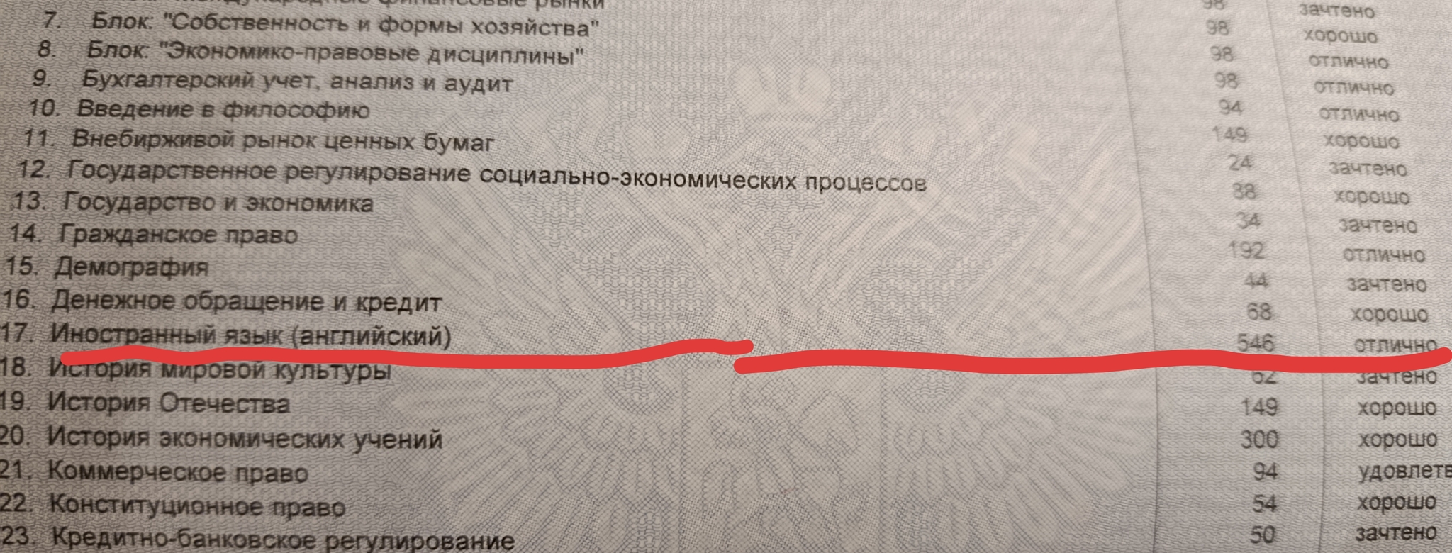 С первого курса у нас был английский. Да ещё и настолько сложный, где несколько оборотов в одном предложении и начинать переводить нужно было аж с конца, чтобы понять смысл. Большие технические тексты, много новых слов и конструкций. Препод была очень строгая, но мне нравилась, так как преподавала она интересно, и в целом язык мне давался легко. На зачетах я быстро отвечала и она меня выделяла из всей группы, часто ставила в пример. А на гос экзамене вызвала первой, так как никто не решался начать. У нас была задача перевести статью из газеты. И я прям на ходу, почти не пользуясь словарем, перевела сразу всё. Преподавательница сказала, что я ее лучший ученик, а экзаменаторы уважительно покивали и поставили мне твердую 5. До сих пор слышу в ушах это "Вот с кого нужно брать пример! Отличный перевод!".