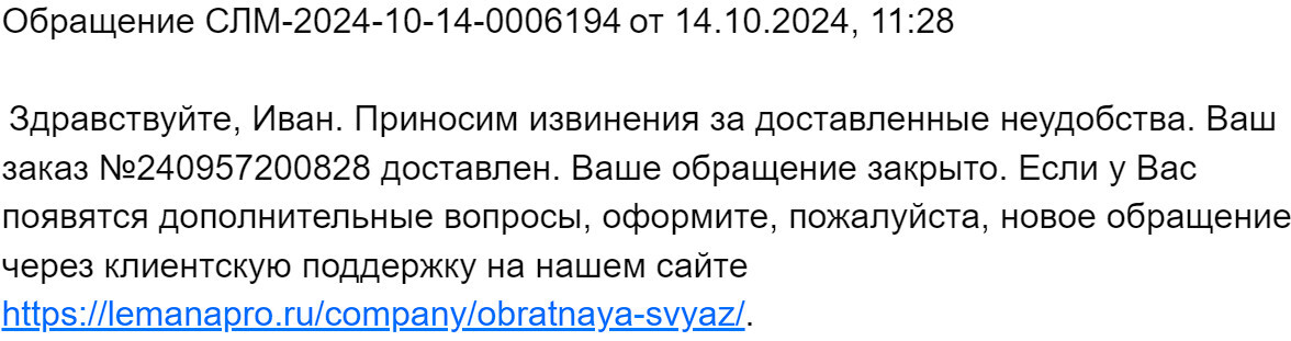 Короче была проделана гигантская работа. Но, к сожалению безрезультатно. Позиция саппорта мне вообще не понятна, будто абсолютно невменяемые люди там работают. Ты потерял заказ и предлагаешь мне решать вопрос с магазином??? Требовать с них возврат денег? Пиздец кароч, ноу коментс. И все же я решил позвонить в Леруа, ведь как мне говорили их толерантность не знает границ. По телефону меня внимательно выслушали и предложили соединить с магазином, дабы ускорить решение вопроса. Я согласился, повис на телефоне в ожидании и через несколько минут тот же самый голос сказал, что говорить со мной магазин не будет, свою работу он выполнил, ежели желаете, можете подать претензию на сайте. На этом беседа закончилась и я поперся на сайт, писать претензию. Ответ я получил вот такой: