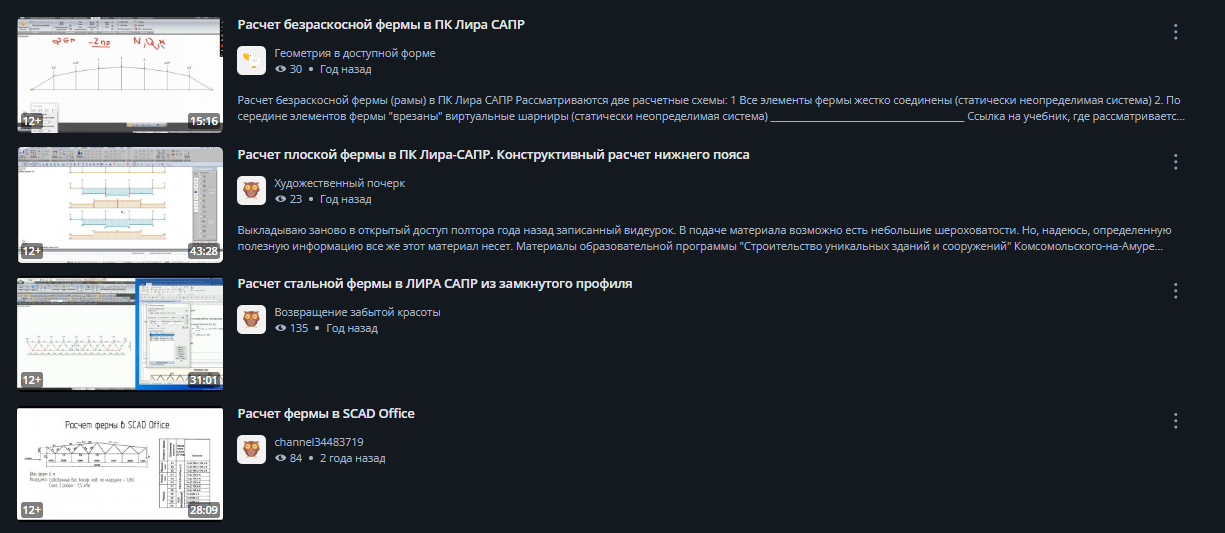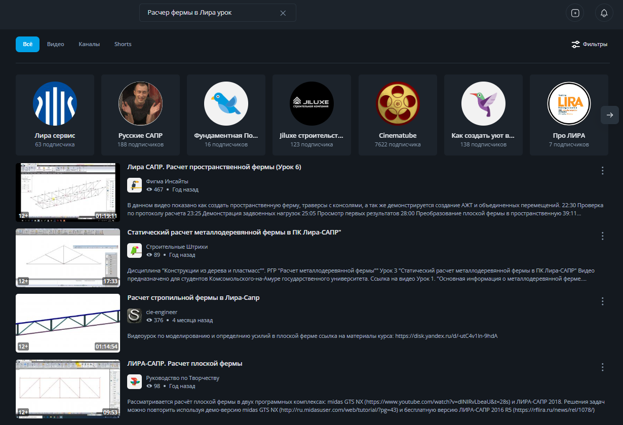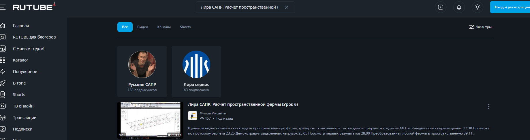 Возможно не самый удачный пример, не помню что именно я в прошлый раз заводил в запрос. Но тоже показательно. Нужно выполнить расчет в программе Лира. Нахожу в Рутубе один урок, и всё бы ничего, но это уже шестой урок. Ищем предыдущие. Коварный Ю-туб нас чему научил? правильно, нужно зайти на канал с этим уроком и найти все оставшиеся и предыдущие части...