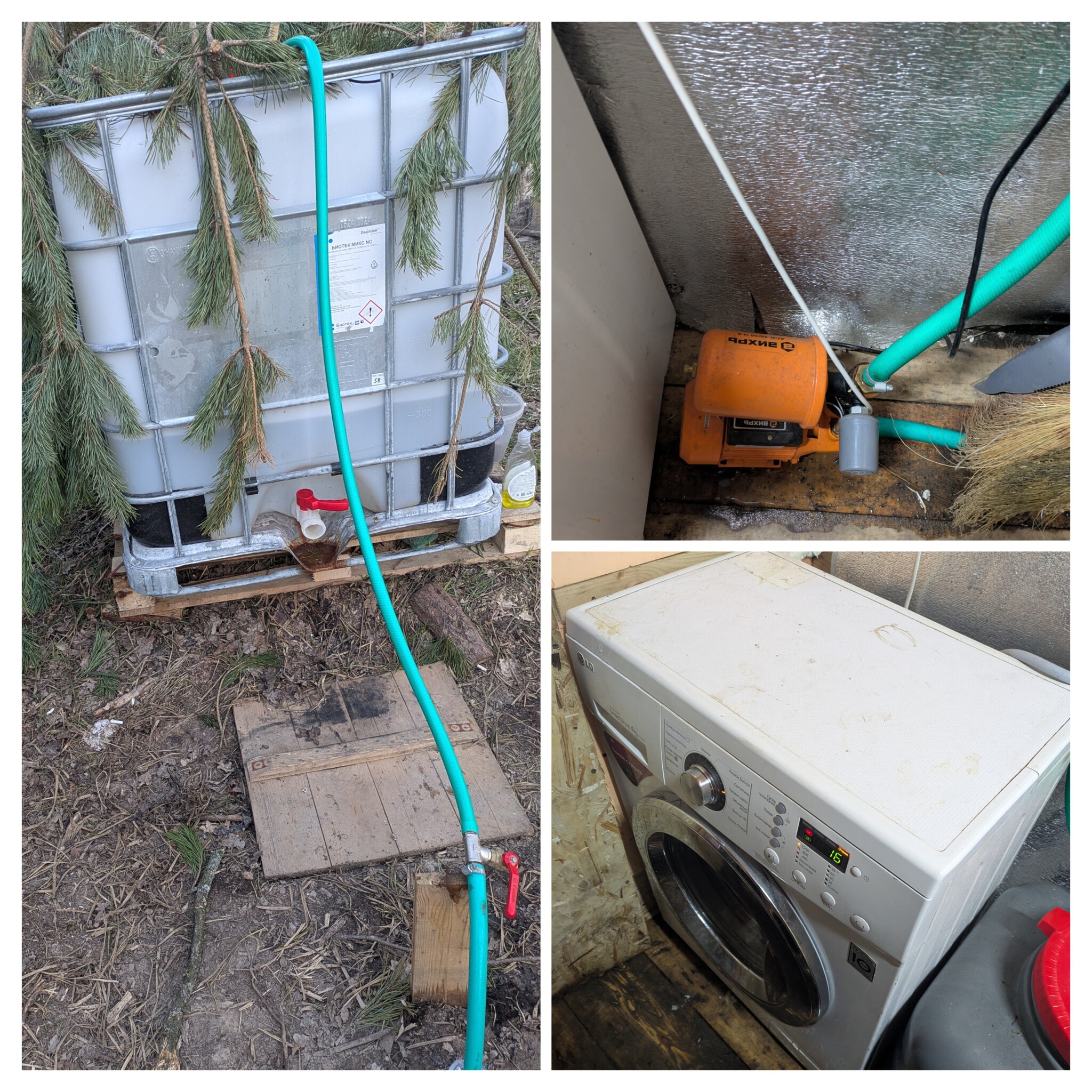 Далее — шланг заходит в землянку. Там — гидростанция, она же насос. Давление подаётся на умывальник и стиральную машину. Отработанная вода уходит по уклонной траншее в закопанную бочку — периодически откачиваем.