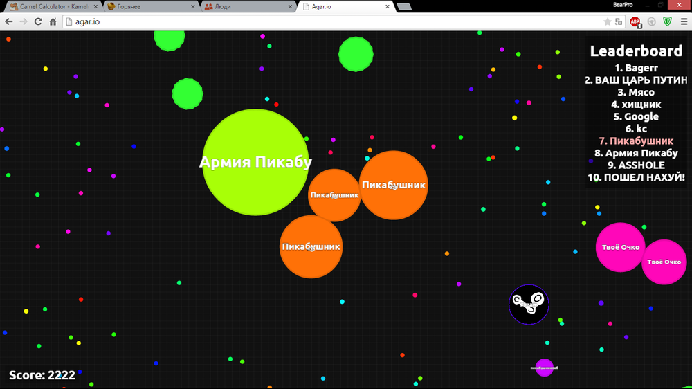 Только что играл в Agario, на русском сервере. У меня был ник Пикабушник, а у кого-то другого был "Армия Пикабу". Друг, отзовись, у тебя остались скрины момента, где мы только встретились, когда я был поделён партов на 15? В общем, прошу: Выложи в коменты все скрины, которые есть. Думаю людям будет интересно и весело. Или пили отдельным постом, мне плевать. Три комента для минусов внутри.