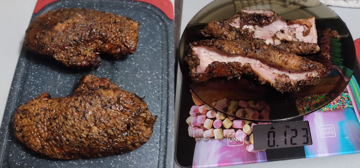 Результат скорее неприятный. На 500г веса мы получили около 100г жидкости и 104г жира с кожей. Самое омерзительное было то, что большой, целый шмат жира и кожи обнаружился уже при непосредственном употреблении на праздничном столе. За такие деньги я никак не ожидал увидеть что-то столь отталкивающее. При всем при этом мясо очень вкусное, прям на десяточку.
