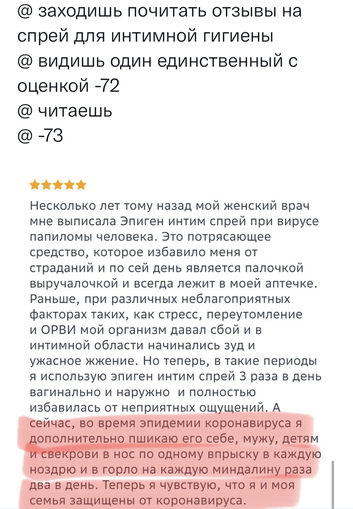 12 DELETED Сервис Отзыв на спрей для интимной гигиены 4 года назад Интимная гигиена Спрей Отзыв Коронавирус Самолечение Скриншот Ещё 0