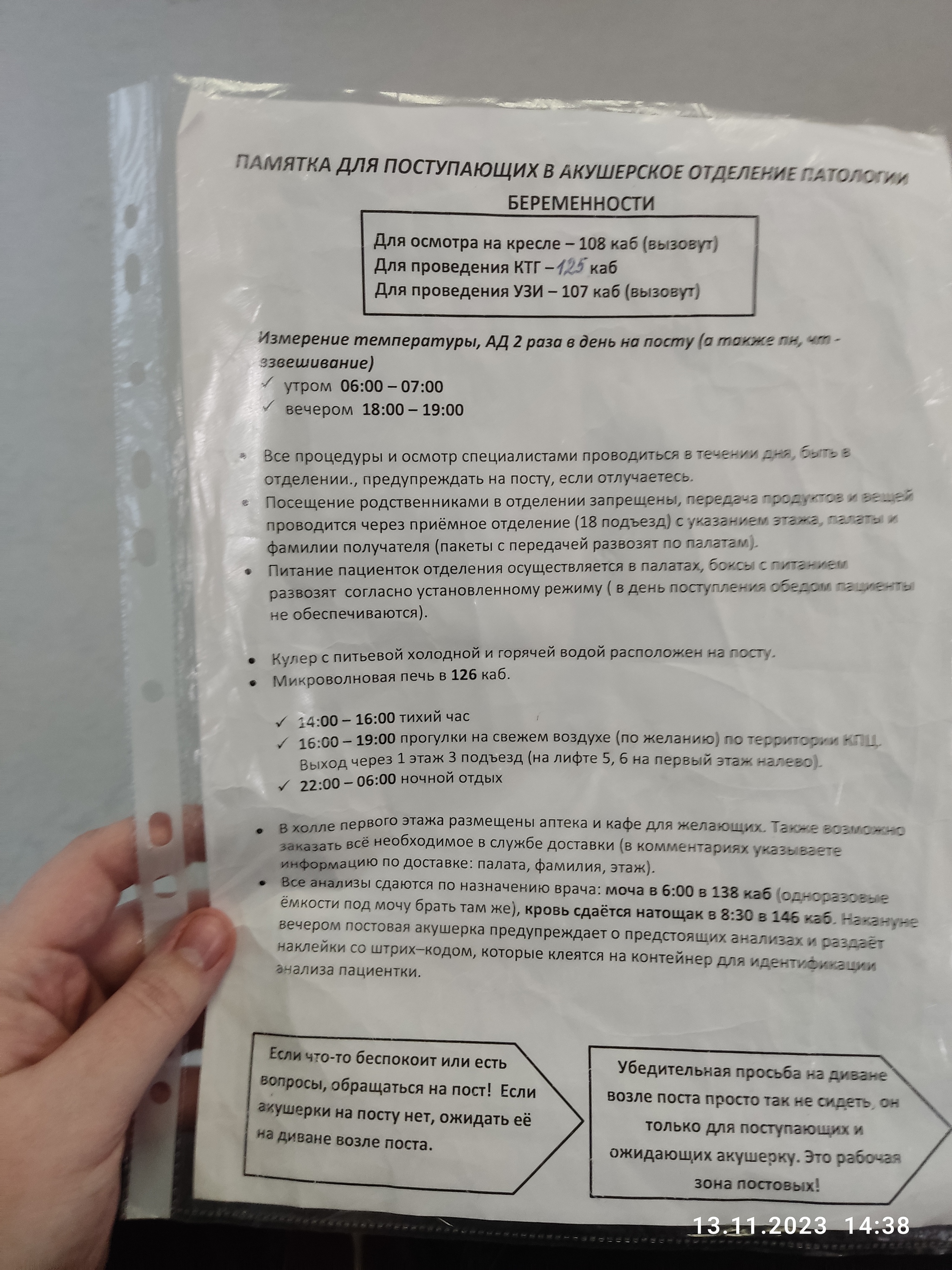 Прибыв на место мне предлагают отдать верхню одежду мужу. Я отдаю (это моя первая ошибка, не делайте как я). Меня оформляют и ведут в отделение патологии беременности. Почему просто не сделать отделение для дохаживающих - непонятно, ведь таковых там большинство и мест всегда не хватает. Настолько не хватает, что даже некоторые кабинеты без туалета и душа переделывали под палаты. В отделении мне дают ознакомится с распорядком дня:
