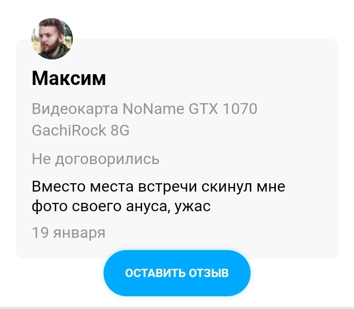 3333 Zdesnezdes 4 года назад Отзыв о продавце на Авито Смотрю отзывы на Авито, и тут такое.Ну название видеокарты как бы намекает) Авито Видеокарта Объявление Отзыв Неадекват Скриншот 37 5 5 2 2 Ещё 0