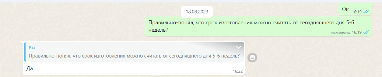 Не буду писать про возможный негативный сценарий. Здесь не так все просто как с обычной покупкой в интернет-магазине, ведь товар изготавливается индивидуально. Но я работаю в интернет-магазине, поэтому решил, что в случае споров, смогу себя защитить.