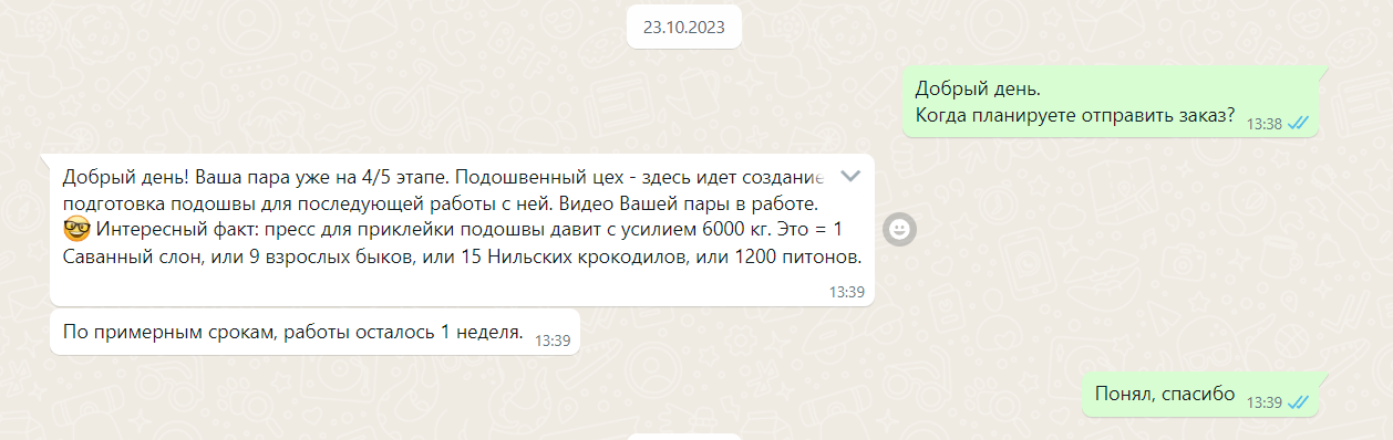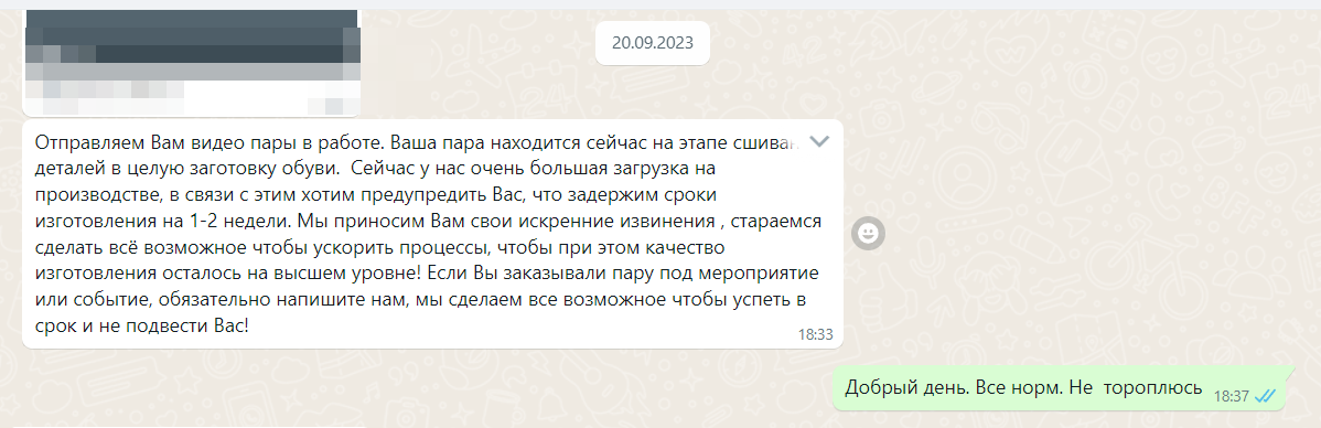 Далее я пишу через месяц 23.10. Делают подошву, через неделю доделают.