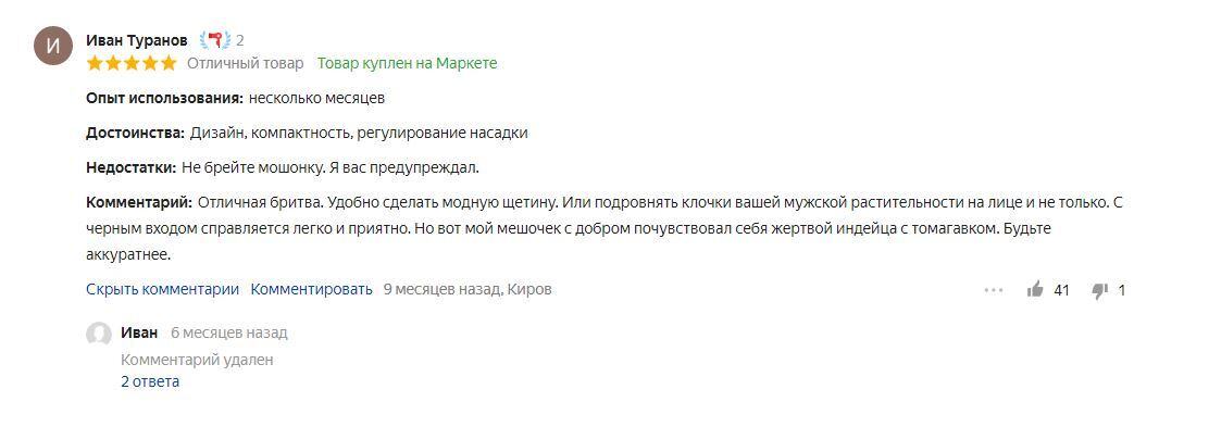 1 russtex 3 года назад Отзывы на Яндекc Маркете Выбирал триммер, прочитал один из отзывов. Несколько раз перечитал про "черный вход", подумал, что это, скорее выход. Но люди разные, кому и вход ... [моё] Яндекс Маркет Юмор Отзыв Ещё 0