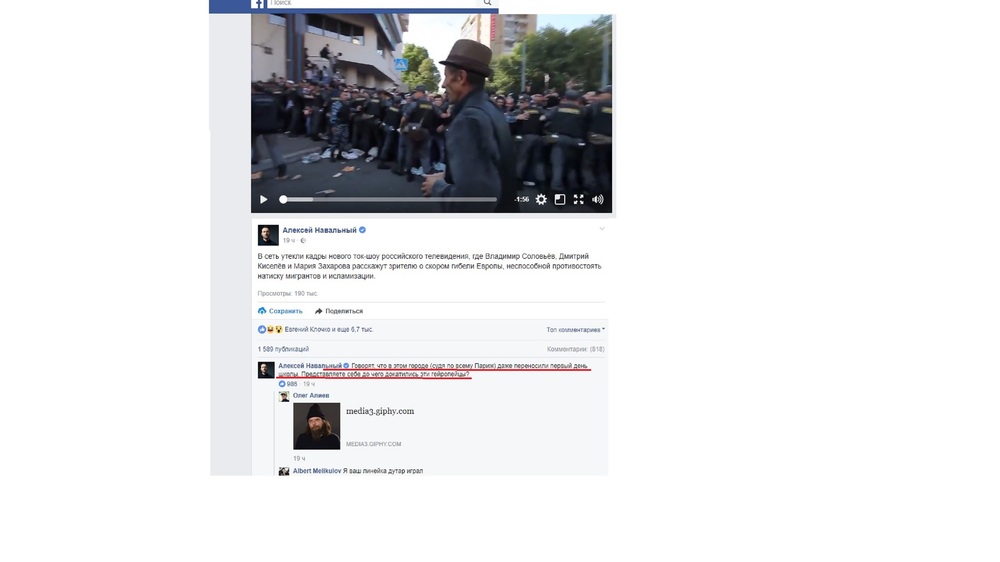 К этому видео он привязывает ситуацию с беженцами в Европе. Первый же комментарий онального: " Говорят, что в этом городе (судя по всему Париж) даже переносили первый день школы. Представляете себе до чего докатились эти гейропейцы?"