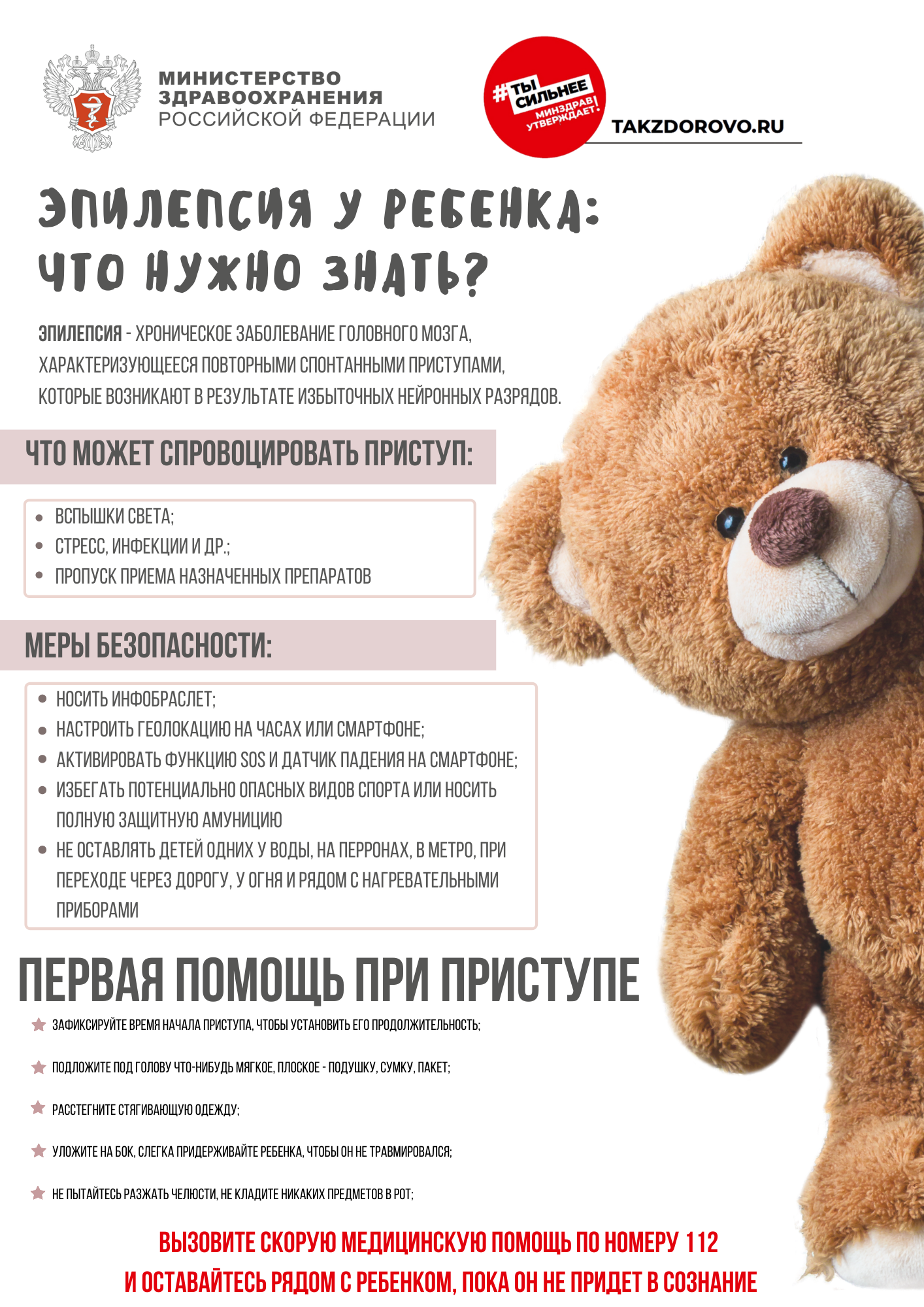 Наконец-то через 4 года Минздрав РФ сделал памятку по эпилепсии. В памятку входит не только первая помощь при приступе, но и правила безопасности для жизни с эпилепсией (риск падения, утопления, ожога) .