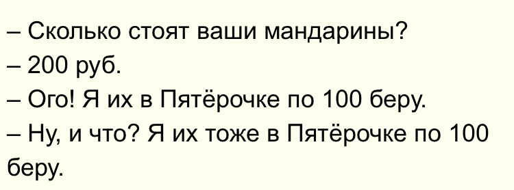 4091 MirVcegda23 Юмор Ой, все1 1 год назад Юмор Торговля Цены Рынок Анекдот Скриншот Мандарины 117 3 3 2 1 Ещё 0