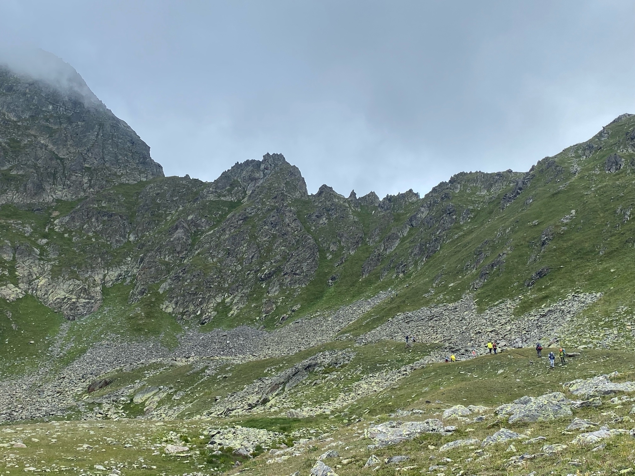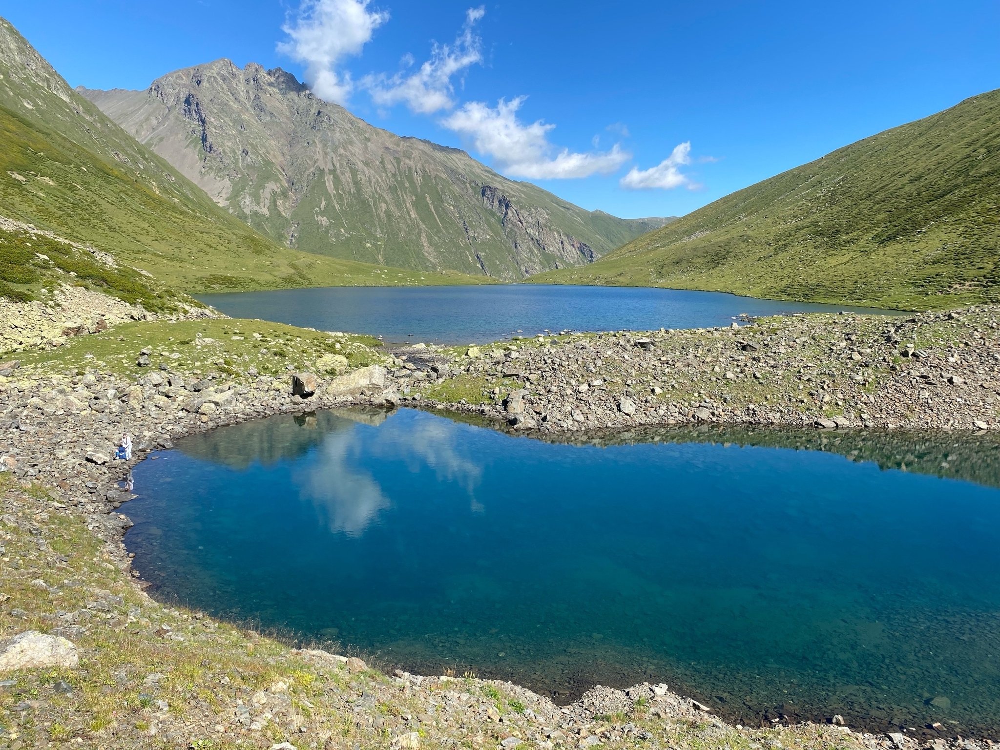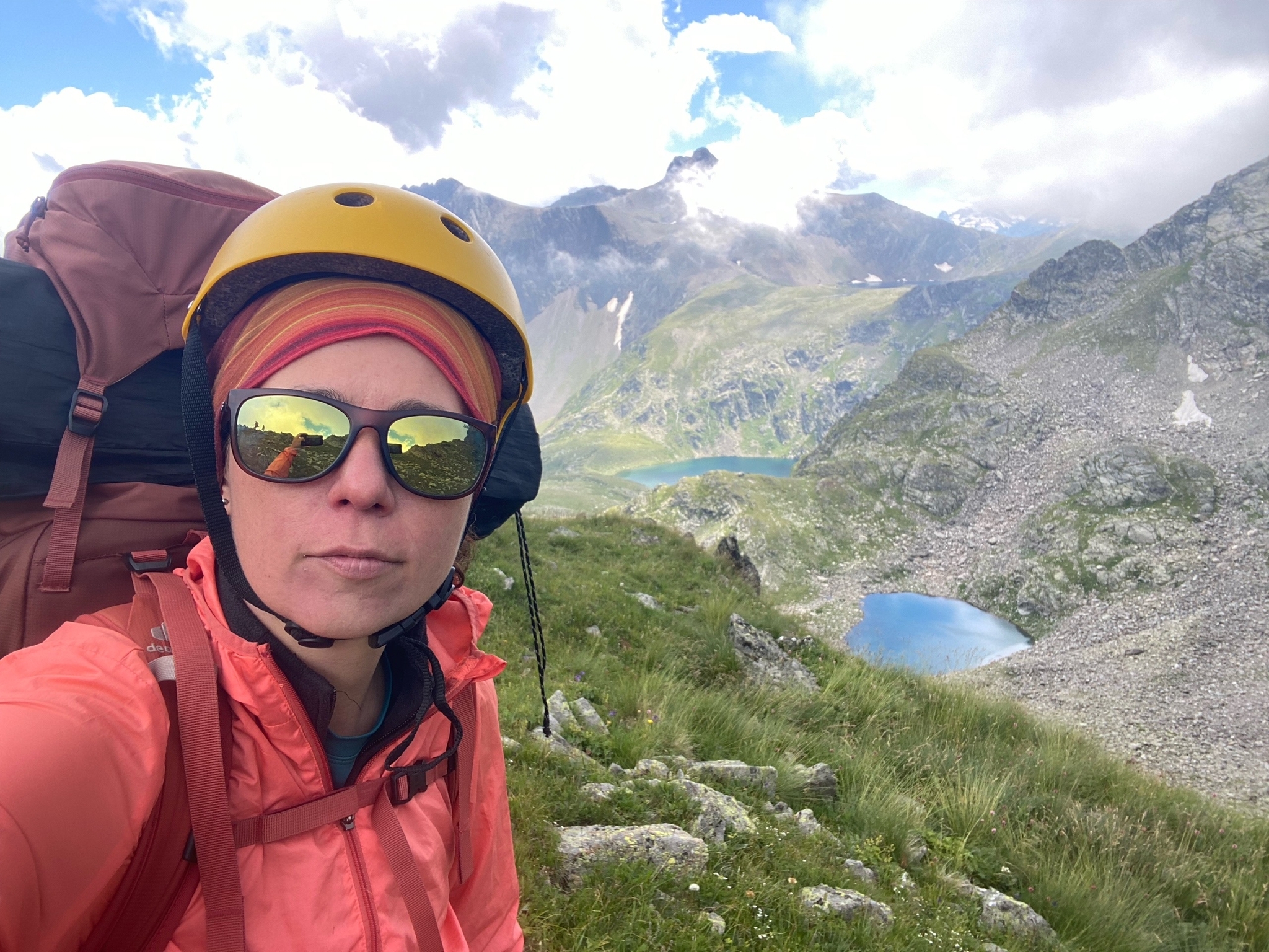 Тут уже стали появляться люди, по-моему здесь встретили крымчан, они стояли на озере Перевальном и делали радиалку на озеро Чилик. Удивились, что мы все в касках))