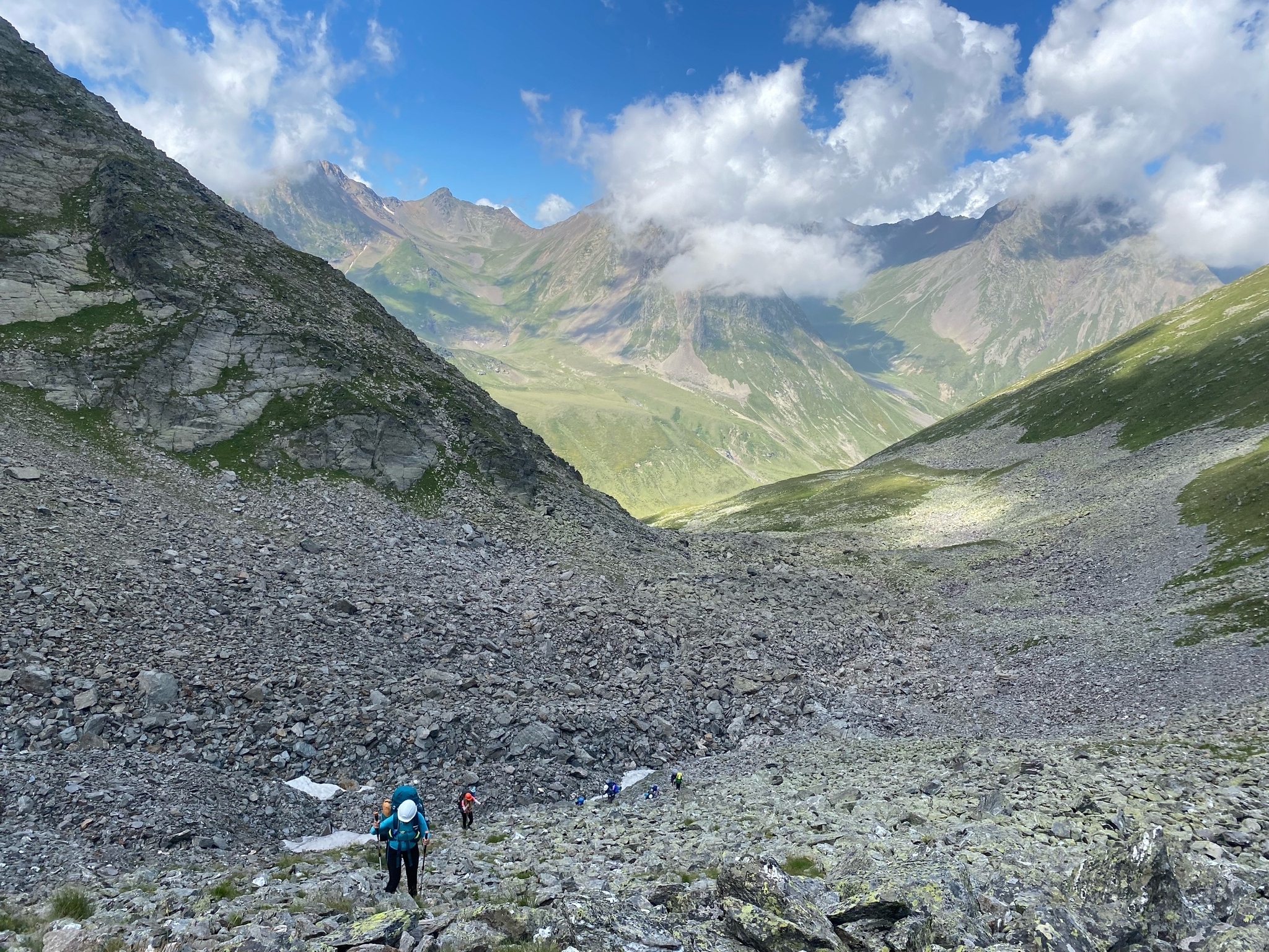 Шли на перевал Кынхара 1А, высота под 3000 м. Погода хорошая, теплая, облачность. На перевале были в куртках легких. Дело было в августе.