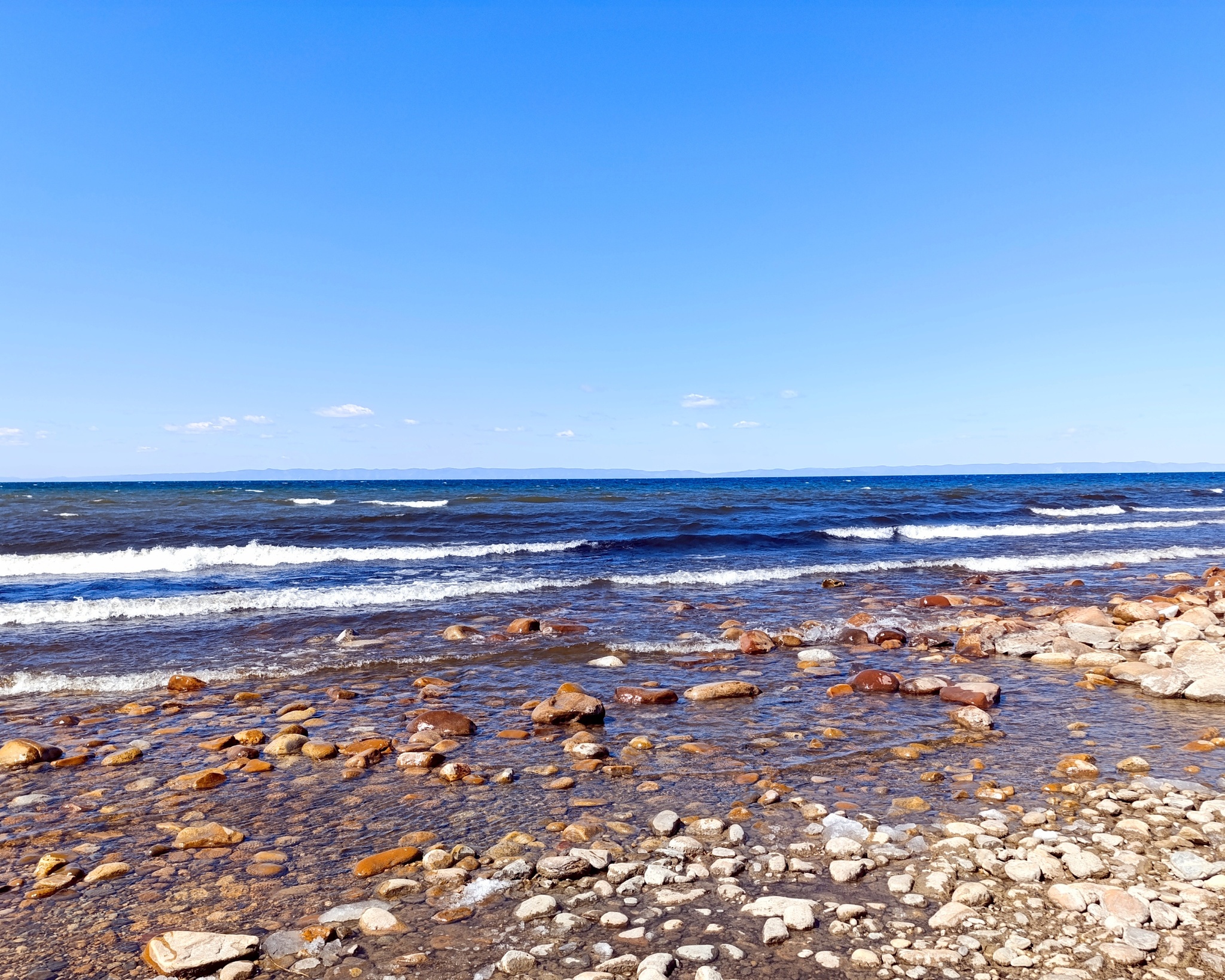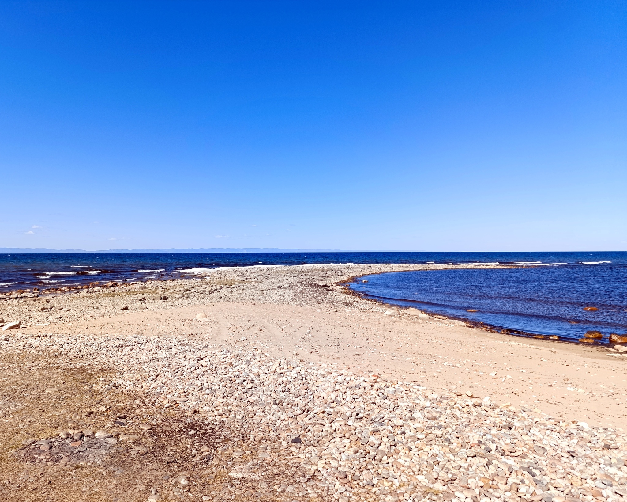 Проехал под железнодорожным мостом и вот он, красавец Байкал. Каких-то 20 метров от меня. Ещё метров 300-400 и я один, на берегу, с красивейшим видом. Сзади то и дело проходят грузовые составы, сильный холодный ветер, солнце, и небольшие волны. Я холод сильно недолюбливаю, но как, кааак я не постою здесь, у воды Байкала?!