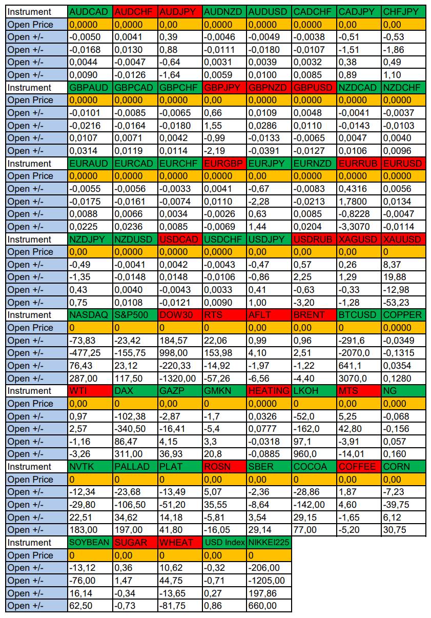 Весь перечень анализируемых активов указан ниже в общем количестве 61 инструмента. Здесь Вы найдете активы рынка Форекс, популярные активы Московской биржи, не менее популярные активы Чикагской биржи СМЕ и мажор криптовалютного сегмента - Биткоин, за которым следуют все альткоины.
