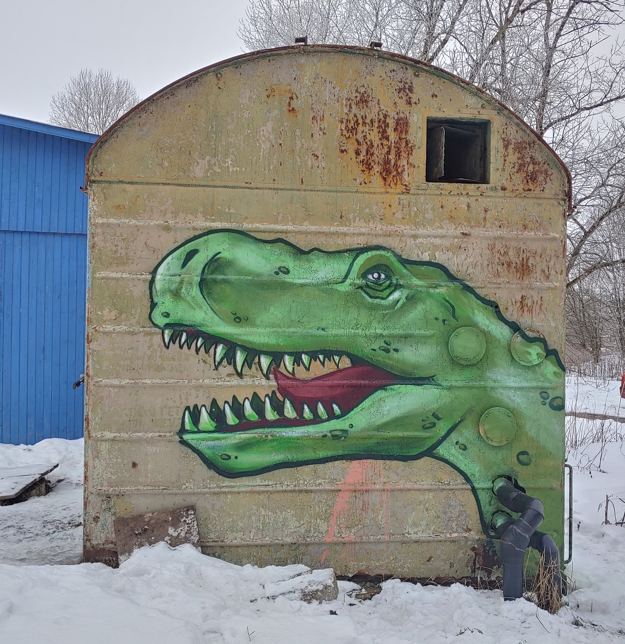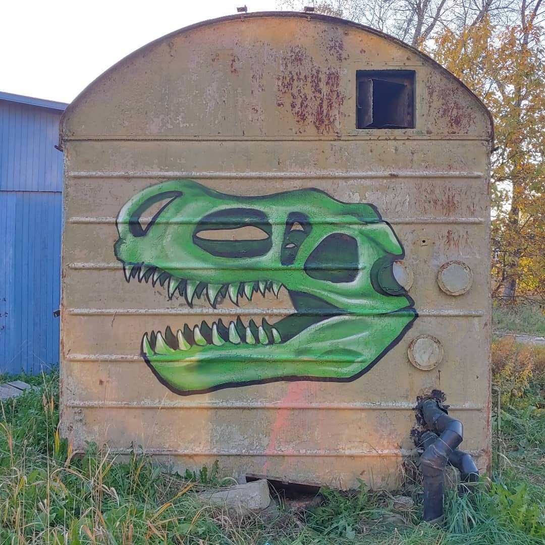 В прошлом году у меня было настроение крайне отвратное, и я это переносил на стены, ходил, рисовал черепа. Не людей, конечно - так, животных всяких, динозавров. В основном в малолюдных местах, на заброшках, гаражах, и т.д. Вот один из примеров, начало осени, быстрое рисование, гараж неподалеку от ледового катка.