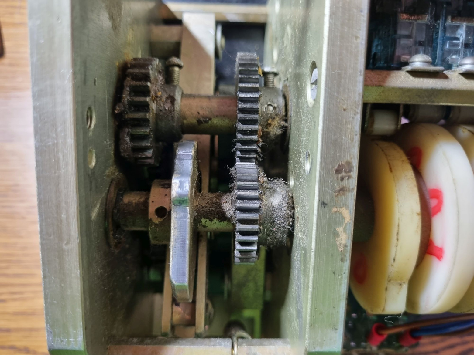 А вот механизм. Дискретное перемещение ручки обеспечивается за счёт детали сложной формы, в которую упирается подпружиненный ролик. Шестерни обмазаны густой липкой смазкой.